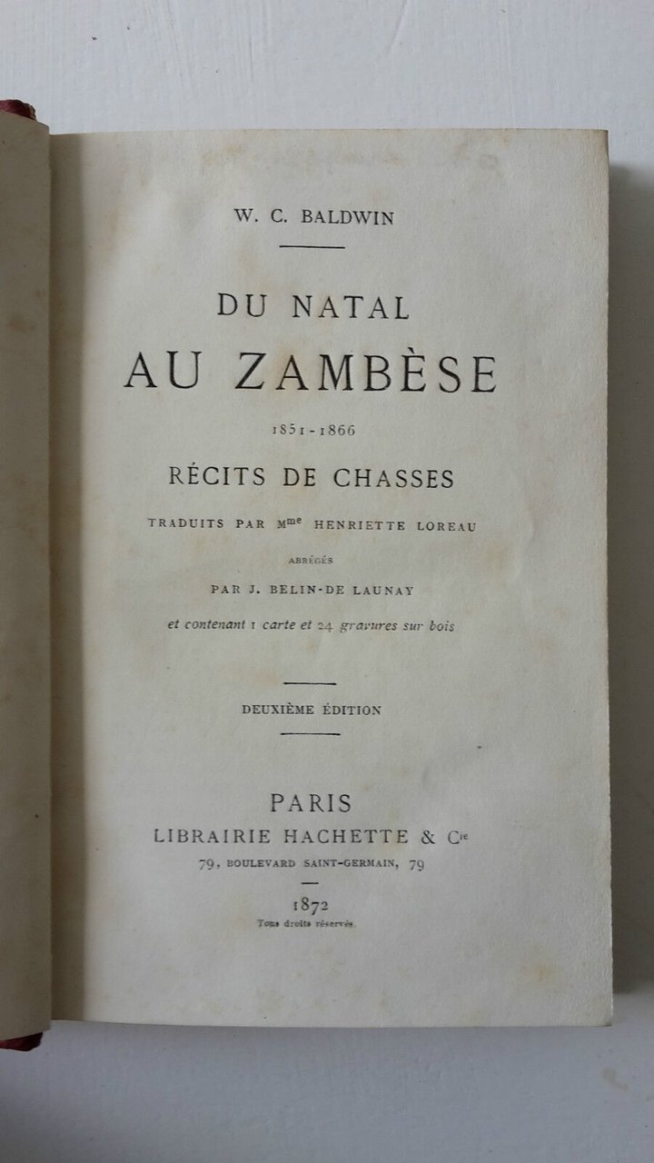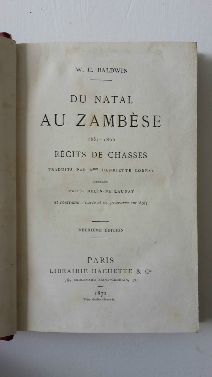 W.C. BALDWIN DU NATAL AU ZAMBESE 1851-1866 RECITS DE CHASSES HACHETTE 1872