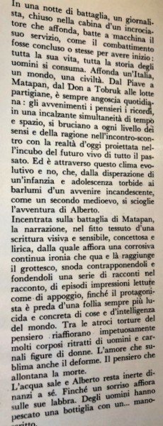 .Nel 1972, sempre con Garzanti, pubblicò il romanzo “W L’i…” che ottenne il Premio Campione per la narrativa. Si tratta di un libro singolare a forte caratterizzazione espressionista e visionaria, dove l’elemento autobiografico inteso come recupero memoriale da analessi si stempera nel flusso narrativo che, incentrato sulla battaglia navale di Matapan, offre una moderna scrittura concettosa e lirica insieme, complessa certamente, ma di sicuro valore letterario.