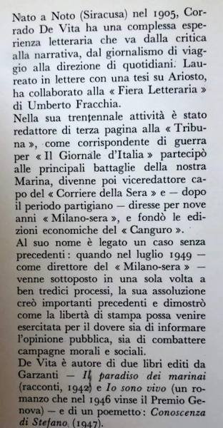 De Vita era nato a Noto nel 1905 e si era laureato in Lettere a Napoli, allievo di Francesco Torraca, trattando una tesi su Ariosto. Diede inizio alla sua attività letteraria collaborando a “La Fiera Letteraria” di Umberto Fracchia, all’ “Italia Letteraria” e quindi fu redattore della pagina culturale della “Tribuna”, per passare al “Giornale d’Italia”, del quale fu corrispondente di guerra imbarcato sugli incrociatori della Regia Marina “Duilio”, “Cesare”, “Eugenio di Savoia”, partecipando a diverse imprese, tra cui la famosa battaglia di Capo Matapan che si risolse in un disastro per la nostra Marina. Da quella esperienza marinara nacque nel 1942, a guerra ancora in corso, una raccolta di racconti, “Il paradiso dei marinai” pubblicata da Garzanti. Nello stesso anno entrò al “Corriere della Sera”, con l’incarico di vice-caporedattore. Il sabato, racconta Salvatore Merlo nel suo libro “Fummo giovani soltanto allora”, egli partiva per Roma e rientrava puntualmente il lunedì sera. Andava a Roma a tenere i contatti col Partito comunista clandestino, ma anche a trovare la moglie, la pittrice Caterina Castellucci, detta Katy, insegnante all'Accademia di Belle Arti di Roma, che aveva sposato nel 1940.