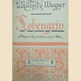 Lohengrin. Grande opera romantica in tre atti, parole e musica di Riccardo Wagner, tradotta in italiano da Salvatore De C. Marchesi, G. Marchesi e C. Editori-Stampatore, Milano s.d. (1906?), pp. 52, testatina, finalino e capilettera ill. b.n., cm 20, pubblicazione spillata. Alla prima di copertina, applicata etichetta del rivenditore (Stabilimento Musicale F.lli Giannini – Bari). Al margine superiore della prima di copertina, annotazione a biro: Italiano 1906. Fioriture, leggere tracce d’uso, qualche sgualcitura, minima brunitura della carta, per il resto buona copia.