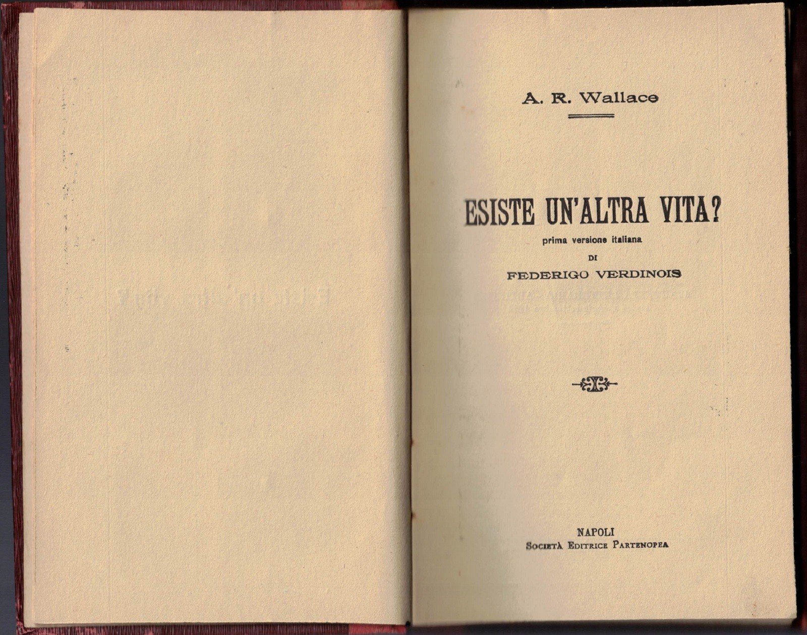 A.R. (Alfred Russel) Wallace, Esiste un’altra vita?, prima versione italiana di Federico Verdinois, Società Editrice Partenopea, Napoli 1882, pp. 115, cm 19, legatura in mezza tela con titoli al dorso. Indice: Prefazione – Esiste un’altra vita? – Della realtà obiettiva dei fantasmi – Delle pretese allucinazioni collettive – Fantasmi la cui obiettività è provata da rapporti definiti di spazio – Impressioni sugli animali – Effetti fisici prodotti o determinati dai fantasmi – I fantasmi possono essere fotografati e sono per conseguenza realtà obiettive – Che cosa sono i fantasmi e perché appariscono. Minime fioriture ai tagli, leggera brunitura della carta, per il resto ottimo esemplare.