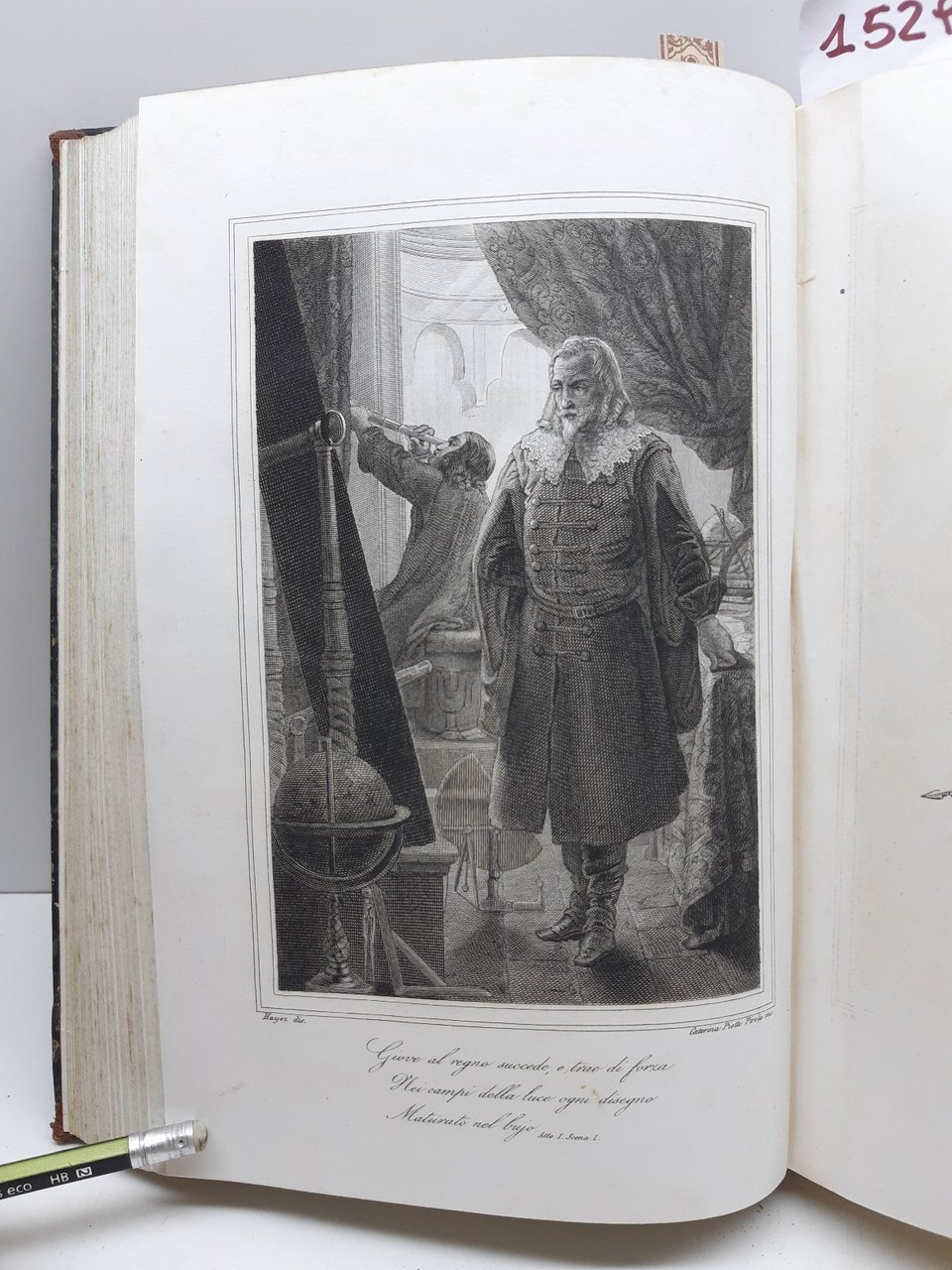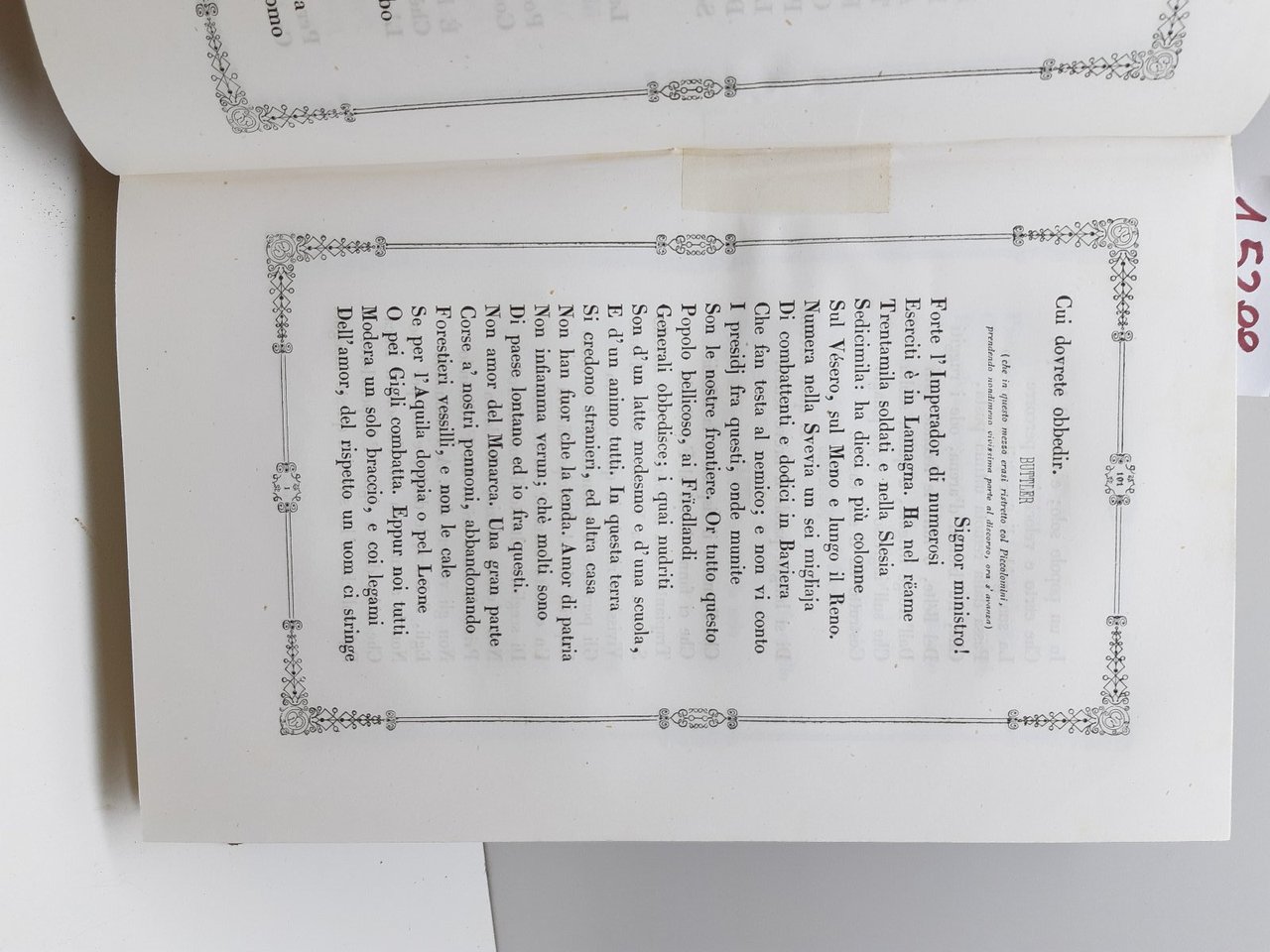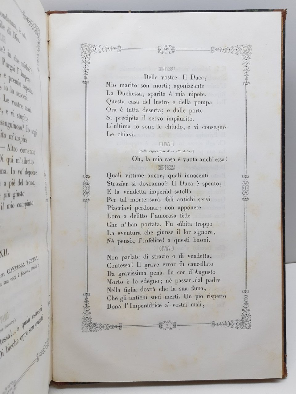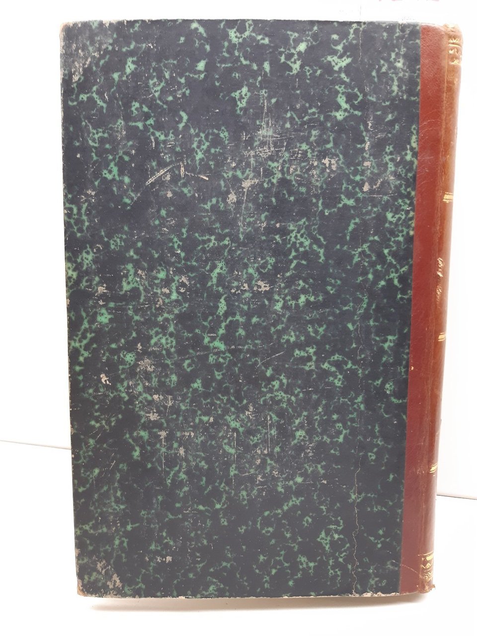 Due tomi in un volume, legatura rigida in mezza pelle con piatti marmorizzati e dorso in pelle marrone, in condizioni accettabili, segni del tempo e abrasioni agli angoli, dorso con fregi in oro ed etichetta di catalogazione, tagli spruzzati leggermente bruniti impolverati quelli superiori, alla seconda di copertina ex-libris, fogli di guardia colorati, due incisioni alle antiporte, fioriture e aloni diffusi ai piatti, in particolar modo alle prime ed ultime pagine, un restauro al margine interno della pag. n. 101, testo entro cornice con motivi floreali, numero pagine 262 + 270, dimensioni cm 25,8 x 17,5