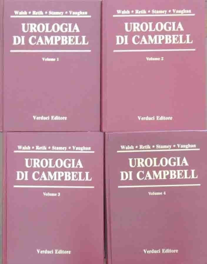 Patrick C. Walsh et al., Urologia di Campbell, Verduci Editore, Roma 1993, 4 voll, seconda ed. italiana tradotta dalla sesta ed. americana, pp. LIV, 3350, ill. b.n. e col., cm 29, legatura in similpelle ed. con titoli in oro al dorso e al piatto. Opera complete in 4 volumi. Autori: Patrick C. Walsh, Alan B. Retik, Thomas A. Stamey, E. Darracott Vaughan Jr. Titolo originale: Campbell’s urology. Alcune carte con leggere sottolineature a biro, per il resto perfetti.