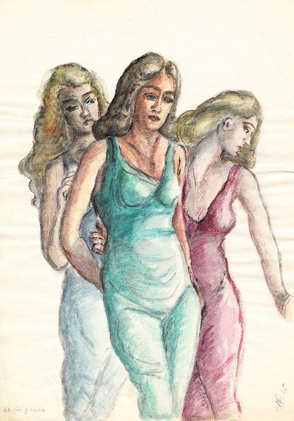 disegno originale all'acquarello firmato di Walter Gualtiero Schonenberger formato 21X29,5 cm circa"Le tre grazie"; buon es.