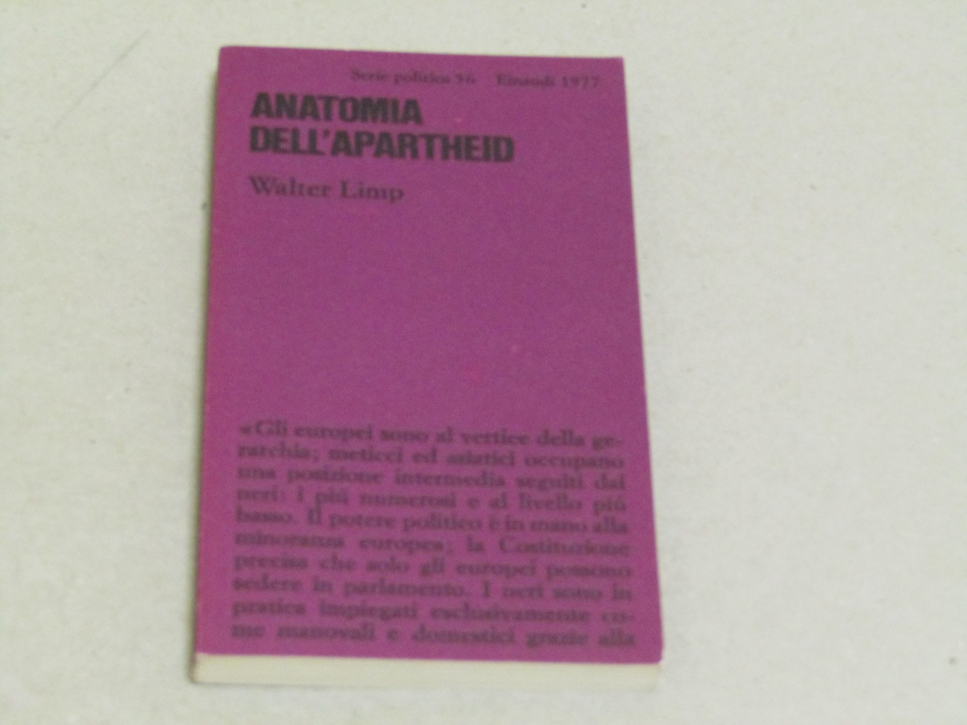 Walter Limp Walter Limp. Anatomia dell'apartheid. Torino, Einaudi 1977 - I italiano, in sedicesimo pp.186 Libro sulla storia dell'Apartheid del Sud Africa. Bordo superiore del dorso leggermente usurato.