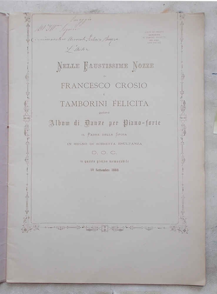 Walzer la virtù. Mazurka l'Onestà. Polka Il Comune affetto. Nelle illustrissime nozze di Francesco Crosio e Tamborini Felicita questo album di danze per piano-forte il Padre della Sposa in segno di schietta esultanza. 10 Settembre 1888.