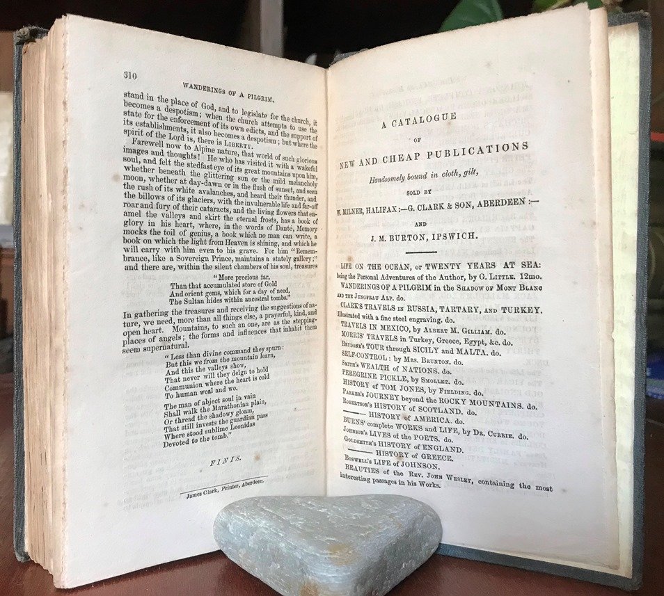 Volume in 8 (19 cm.), legatura editoriale in tela impressa a sbalzo, titolo al dorso in oro, sguardie (firma di precedenti possessori), occhiello, frontespizio, prefazione, 310 pp., (2) pp. di pubblicit editoriale. Magnifico e dettagliato resoconto delle escursioni dellautore nel territorio Alpino. Centinaia di pagine descrivono questo magnifico viaggio della prima met dellottocento, che parte da Ginevra, attraverso la valle del Rodano, il Monte Bianco, Chamony, le Cascate dei Pellegrini, poi in Italia attraverso il Valico del Gran San Bernardo, dalla Valle dAosta ad Ivrea e Torino; nella seconda parte il viaggio si snoda attraverso il territorio del lago Lemano, delle terme di Leuka e Berna, lo Jungfrau e le sue valanghe, i ghiacciai del Grindlewald, Zurigo, Locarno, fino al Lago di Como e Milano. Oltre che della parte descrittiva e tecnica lopera ricca di spunti naturalistici e di costume dei luoghi visitati con attenzione ed amore. Davvero interessante e particolare. Lievi e sporadiche fioriture della carta. In pi che buono stato.