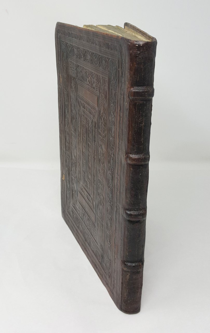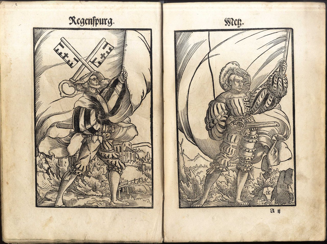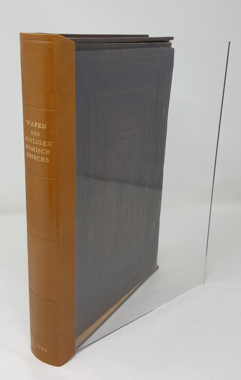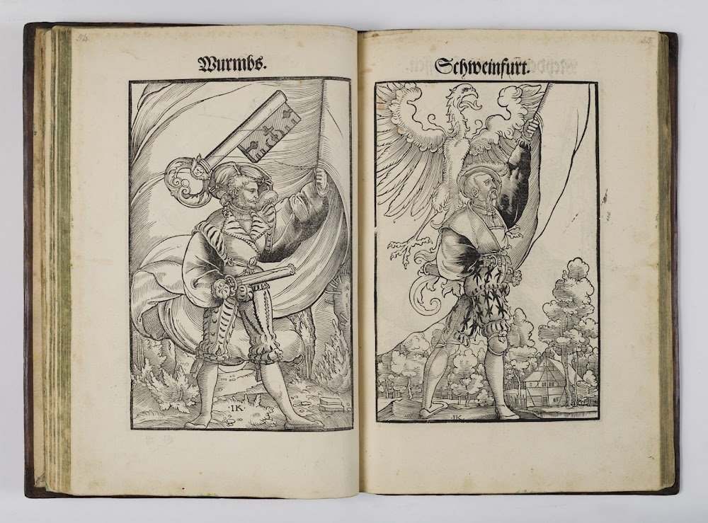 >2 opere in un volume in folio piccolo (292x200 mm), importante rilegatura tedesca in cuoio con dorso a 4 nervi, piatti sono riccamente decorati a secco da varie serie di bordure concentriche che includono santi e profeti a figura intera, scudi, teste di re e imperatori del SRI; (abilissimi restauri alla cerniera anteriore, a cuffie e spigoli) il tutto racchiuso in un bel cofanetto con piatto anteriore in plexiglass che lascia a vista l'elaborata legatura. Carattere gotico, ff. 86 n.n. (segn.*4, A-L4, a-c4, B-E4, #6, *4). I primi 4 comprendono il frontespizio in rosso e nero con grande stemma imperiale xilografato con allegorie e tre di testo di Jakob Köbel sul procedimento elettivo imperiale, ff. 72 figurati al recto verso e 10 ff. di testo con colophon e impresa tipografica sull'ultimo. L'opera consta quindi di 144 xilografie a piena pagina, di cui 120 con lo stemma principale delle città o dei 37 Principati ed il loro nome in alto e 24 con vessilli privi di stemma e di scritte in alto (fascicoli a-c4). Un indice manoscritto con eleganza all'epoca sul foglio libero della sguardia posteriore fornisce in ordine alfabetico i nomi delle città di questo esemplare. Seppur con i fascicoli #6 e B-E4 rilegati verso la fine dell'opera, l'esemplare è conforme a quello della MDZ Munchener Digitalisierung (che ha questi 22 fogli all'inizio); mentre altre copie digitalizzate non riportano la segnatura #6. In fine è rilegata l'opera: FRONSBERGER, Leonhardt. Besatzung. Ein kurtzer Bericht, wie Statt, Schlosser oder Flecken. Franckfurt am Mayn, Feyerabend und Hüter, 1564: ff. XVI, (uno con data e impresa tipografica al recto e un bianco). Al frontespizio grande xilografia raffigurante l'imperatore che giunge all'accampamento, 5 figure belliche n.t. L'assieme delle due opere di Köbel comprende un totale di 150 xilografie della prima metà del Cinquecento ed è fonte fondamentale per gli studiosi dei vessilli nonché preziosa documentazione per la storia degli abiti dell'epoca. I 144 emblemi di località della Germania meridionale – tra le altre Aalen, Esslingen, Schwäbisch Hall, Gmünd, Giengen, Reutlingen, Isny, Überlingen, Friedrichshafen (ora Buchhorn), Ulm, Strassburg, Rottenburg am Neckar, Rottweil o Biberach – compaiono su bandiere dipinte sventolate da uomini in costume tradizionale davanti alle rispettive città. Rarissima prima edizione in importante rilegatura d'epoca di straordinario figurato che ritrae i vessilli dei principi e delle città del Sacro Romano Impero, sventagliati da sbandieratori in pittoreschi abiti con sullo sfondo paesaggi (talora realistici, come nel caso di Strasburgo, dove si intravede la cattedrale). Le xilografie sono spesso firmate “IK”, ragione per cui l'opera è da sempre attribuita a Jacob Köbel, che peraltro non solo fu un noto Rechenmeister ma anche un stimato intagliatore. Di recente si è ritenuto più probabile che siano invece opera del pittore e xilografo Jacob Kallenberg (1500-1565), maestro bernese considerato all'epoca al pari di Holbein. L'opera fu ristampata da Schmidt e Feyerabend nel 1579. L'esemplare riporta, oltre a una provenienza tedesca a inchiostro del 1775, un'appartenza a lapis del pittore svizzero Ludwig Vogel (1788-1879) e la data 1829: nei suoi dipinti relativi alla storia elvetica, spesso compaiono portabandiera in costume con stendardi - il che lascia supporre che questo libro gli sia stato d'ispirazione per i suoi quadri. Vogel "fu uno dei più importanti pittori storici svizzeri, il più celebre del suo tempo, anche perché molte delle sue opere, tra cui I Confederati davanti al cadavere di Arnold Winkelried e Il tiro alla mela di Guglielmo Tell, furono riprodotte in stampa e fotografia ed ebbero un'ampia diffusione" (Dizionario Storico della Svizzera). Affascinante esemplare in legatura d'eccezione, sebbene restaurata; foglio di titolo abilmente rinforzato lungo il margine interno, con strappetto restaurato nel margine superiore; pallide macchie di polvere ai primi fogli, piccole macchi