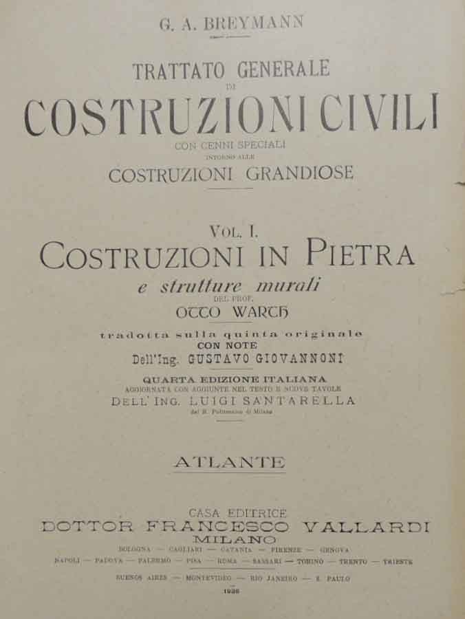 G. A. Breymann, Trattato generale di costruzioni civili con cenni speciali intorno alle costruzioni grandiose. Voll. I. Costruzioni in pietra e strutture murali di Otto Warth, Casa Editrice Dottor Francesco Vallardi, Milano 1926, quarta ed. italiana tradotta sulla quinta ed. originale, con note dell’Ing. Gustavo Giovannoni , aggiornata con aggiunte nel testo e nuove tavole dell’Ing. Luigi Santarella. Atlante, pubblicazione costituita da cofanetto in mezza tela con titoli dattiloscritti al dorso contenente 106 tavv. sciolte ill. b.n. di cui molte ripiegate, cm 29, mezza tela ed. con titoli al dorso. Il lotto comprende il solo cofanetto delle tavole. Tracce d’uso alla carta del frontespizio, con strappetti e piccole mancanze ai margini, per il resto minime fioriture, leggera brunitura della carta, ma ben conservato.