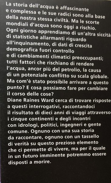 La storia dell'acqua è complessa e le sue radici sono alla base della nostra stessa civiltà. Le scorte mondiali corrono attualmente un grave pericolo di esaurimento: siccità, statistiche allarmanti sull'inquinamento, crescita demografica fuori controllo e cambiamenti climatici sono tutti fattori che rischiano di rendere l'acqua, più del petrolio, la causa di un potenziale conflitto su scala globale. Come è stato possibile giungere a questa situazione? Esiste una soluzione? Il volume è il resoconto di dieci anni di viaggi attraverso i cinque continenti e degli incontri con idrologi, politici e ingegneri. Ognuno con una sua teoria, con un tassello di verità da raccontare su un bene per il quale potremmo essere presto costretti a combattere.
