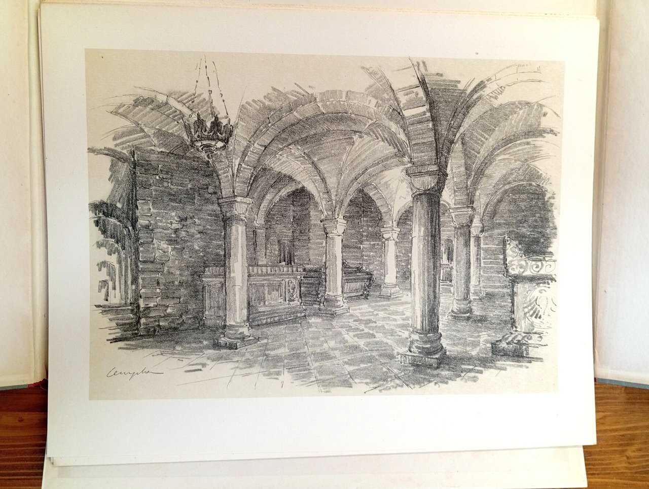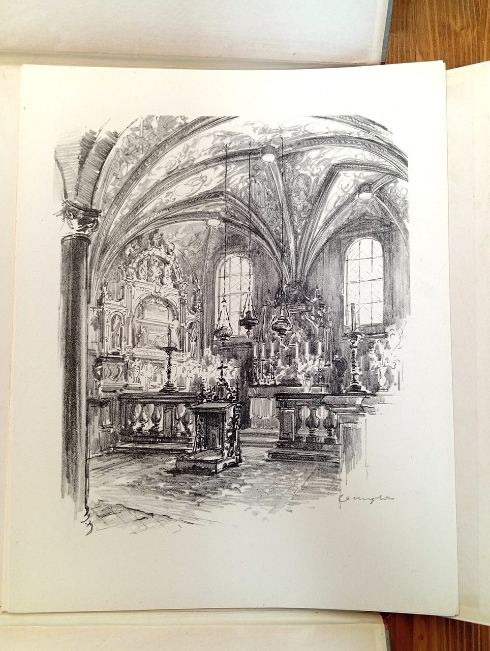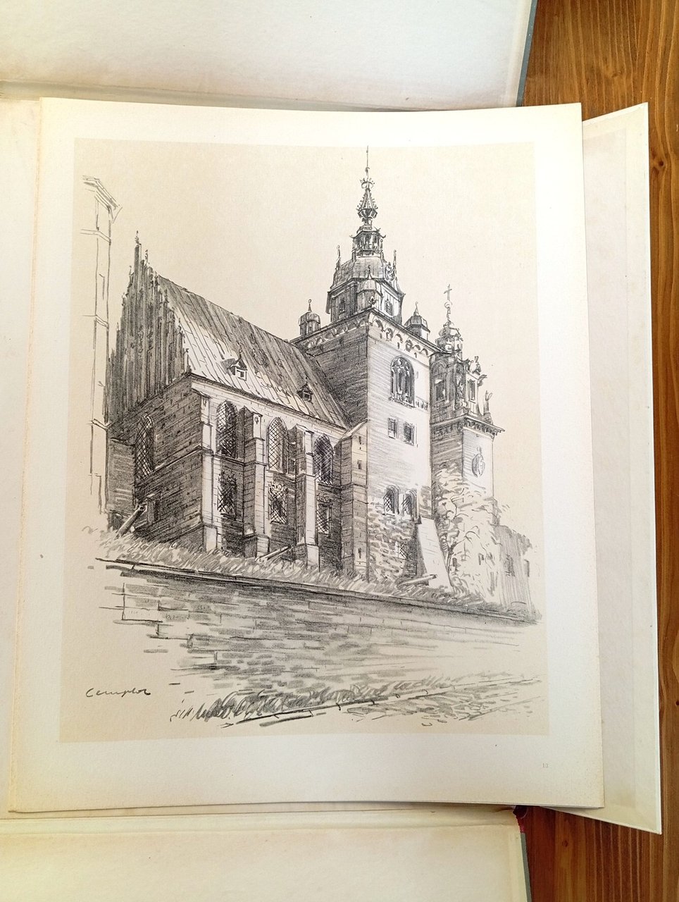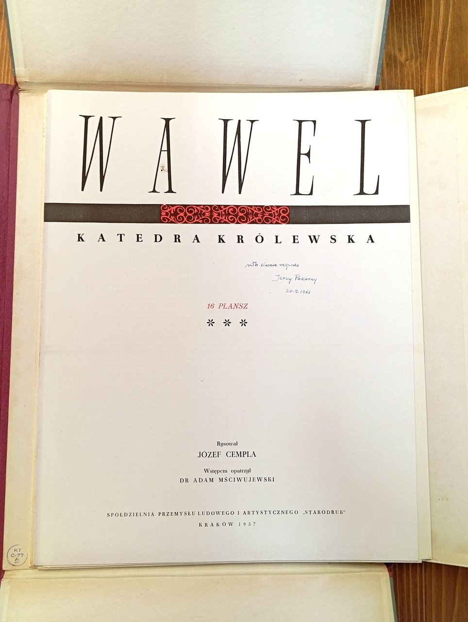 Cartella editoriale in grande formato (38 cm) contenente fogli sciolti, di cui 5 pagine di testo e 16 tavole con disegni dall'artista Jozef Cempla, raffiguranti vari scorci e dettagli della Cattedrale di Cracovia. Introduzione di Adam Msciwujewski. Una dedica a penna alla pagina di frontespizio; tenue ombratura ai margini della cartella, peraltro ottimo esemplare.