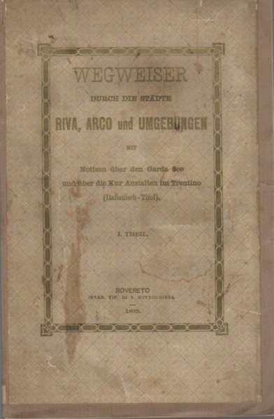 70, [1] p., 24 cm, brossura muta coeva con applicata la brossura originale al piatto anteriore. Condizioni : USATO - Stato : Buono, ordinari segni d'uso e del tempo alla brossura, alcune fioriture e una gora alla parte alta del volume, note di possesso d'epoca al frontespizio. Altre note : Nome dell'A. ricavato da: Tiroler Anonymen-und Pseudonymen- Lexicon von Hans Margreiter. 2. Aufl. Al frontespizio si parla di "prima parte" ma una seconda parte non fu mai pubblicata (cfr. CBT). Ad una prima parte storia segue un capitolo intitolato: "Notizie topografiche e statistiche e escursioni nei dintorni di Riva e Arco". Un capitolo è poi dedicato al clima e alle cure, segue un altro con le escursioni a Solferino e S. Martino. Seguono il prospetto con gli orari dei battelli che solcano il lago e degli Omnibus tra Mori e Riva. Conclude l'opera una sintetica descrizione delle località turistiche del Trentino: Campiglio, Levico, Comano, Rabbi, ecc. Opera non comune.