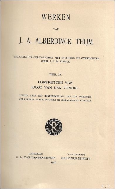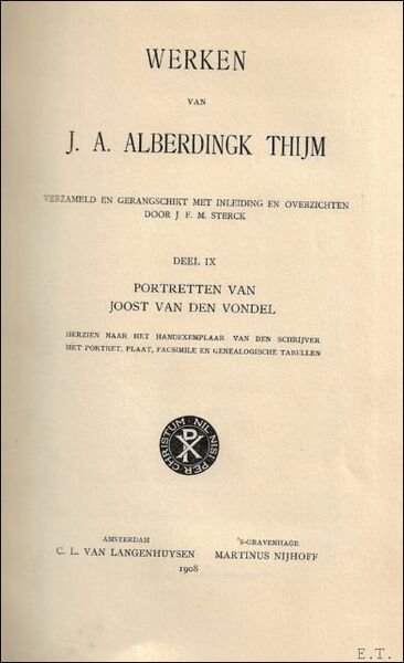 Verzameld en gerangschikt met inleiding en overzichten door J.F.M.Sterck. Dl. IX: Portretten van Joost van den Vondel. Herzien naar het handexemplaar van den schrijver. Met portret, plaat, facsimile en genealogische tabellen.