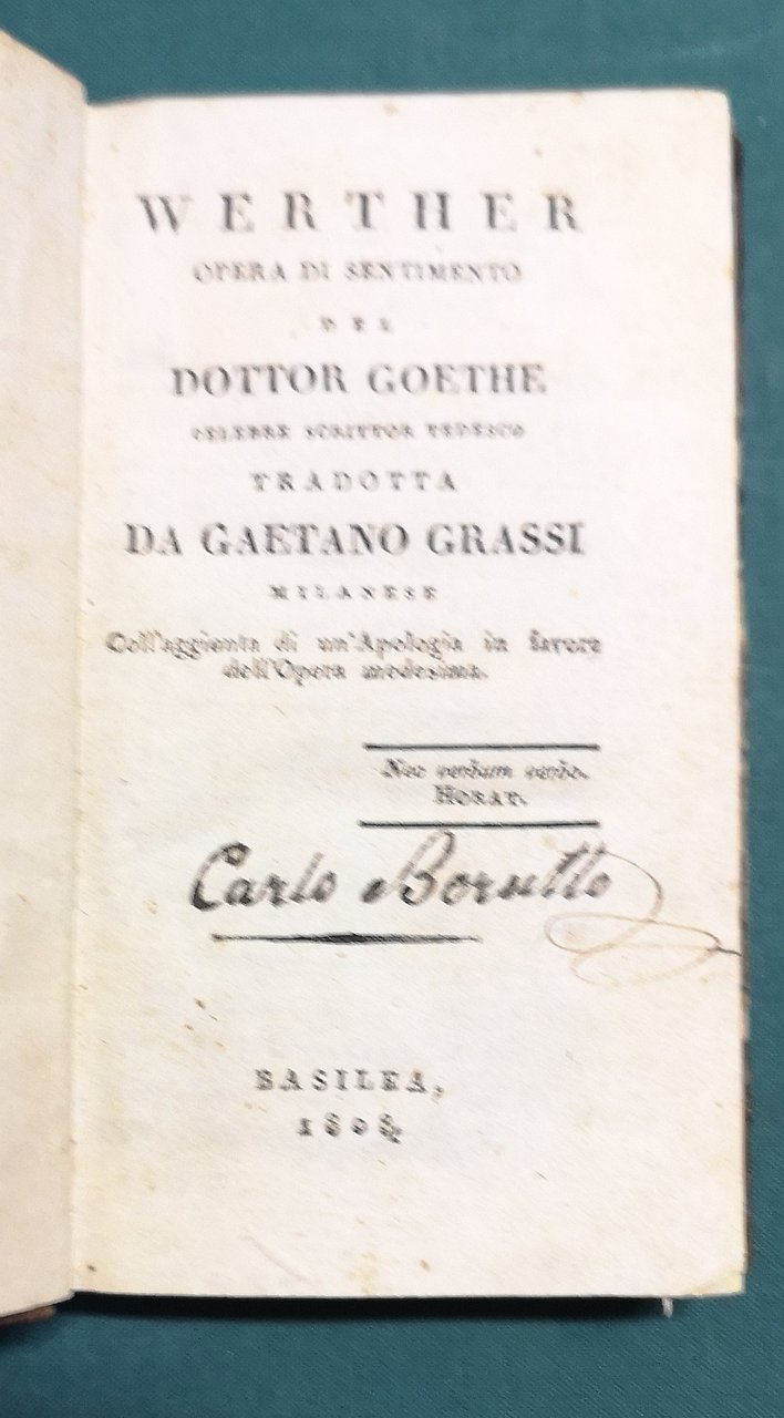 Werther. Opera di sentimento del dottor Goethe celebre scrittore tedesco. Tradotta da Gatano Grassi milanese. Coll'aggiunta di una Apologia in favore dell'opera medesima.