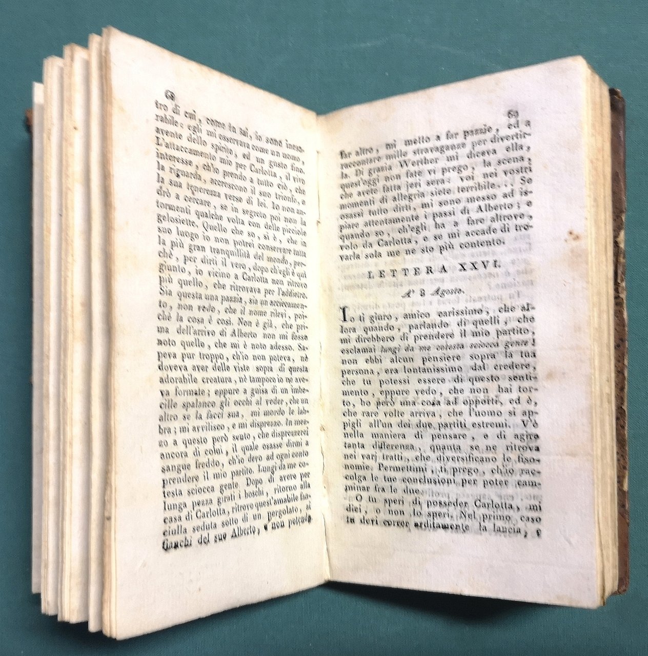 >in-12, pp.192, legatura coeva in m. pelle, filetti e titolo oro al dorso. Traduzione integrale del Werher (ed. orig. 1774), una delle prime italiane del capolavoro di Goethe, uno dei maggiori poeti di tutti i tempi. Rara. Buon esemplare, timbro a secco al contropiatto e firma di possesso al frontespizio.