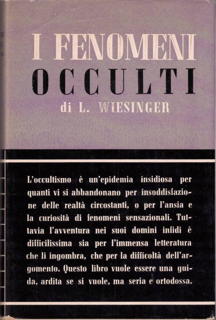 Luigi Wiesinger, I fenomeni occulti, Edizioni Paoline, s.l. (ma stampato a Vicenza, presso la Tipografia Pia Società Sann Paolo) 1956, pp. 322, cm 21, tela ed. con titoli in oro al dorso e sovr. Traduzione della seconda edizione tedesca dell'opera Okkulte Phanomene im Lichte der Theologie (1952) di Ludwig Wiesinger. Fioriture, tracce d'uso alla sovraccoperta, con minimi segni di biro e uno strappetto al margine superiore, timbro d'appartenenza al frontespizio, ma nel complesso condizioni accettabili.