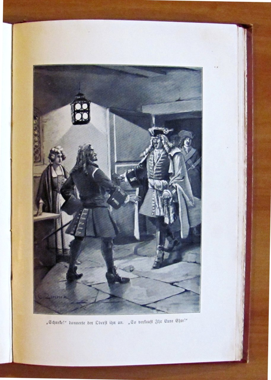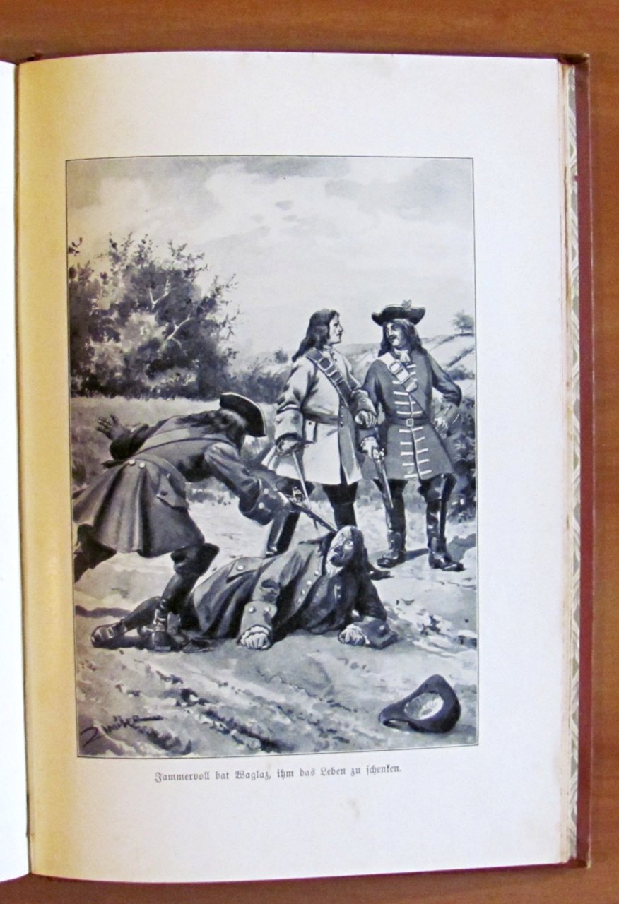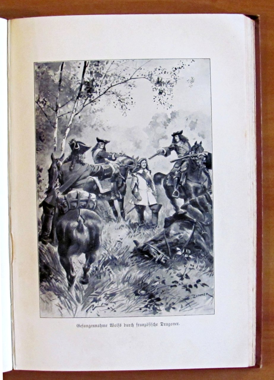 Lupo lo scudiero (?) Storia della guerra dal tempo di Luigi XIV. Con 8 immagini basate sui disegni di Ernst Zimmer. 8 tavole in b/n f.t. di cui una protetta da velina. Ed. Hirt & Sohn - Leipzig, 1907. Tela editoriale con dedica del tempo in antiporta. 16x23; pp.176+16. OTTIMO STATO , Ottimo (Fine)