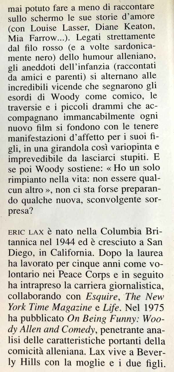 ERIC LAX è nato nella Columbia Britannica nel 1944 ed è cresciuto a San Diego, in California. Dopo la laurea ha lavorato per cinque anni come volontario nei Peace Corps e in seguito ha intrapreso la carriera giornalistica, collaborando con Esquire, The New York Time Magazine e Life. Nel 1975 ha pubblicato On Being Funny: Woody Allen and Comedy, penetrante analisi delle caratteristiche portanti della comicità alleniana. Lax vive a Beverly Hills con la moglie e i due figli.