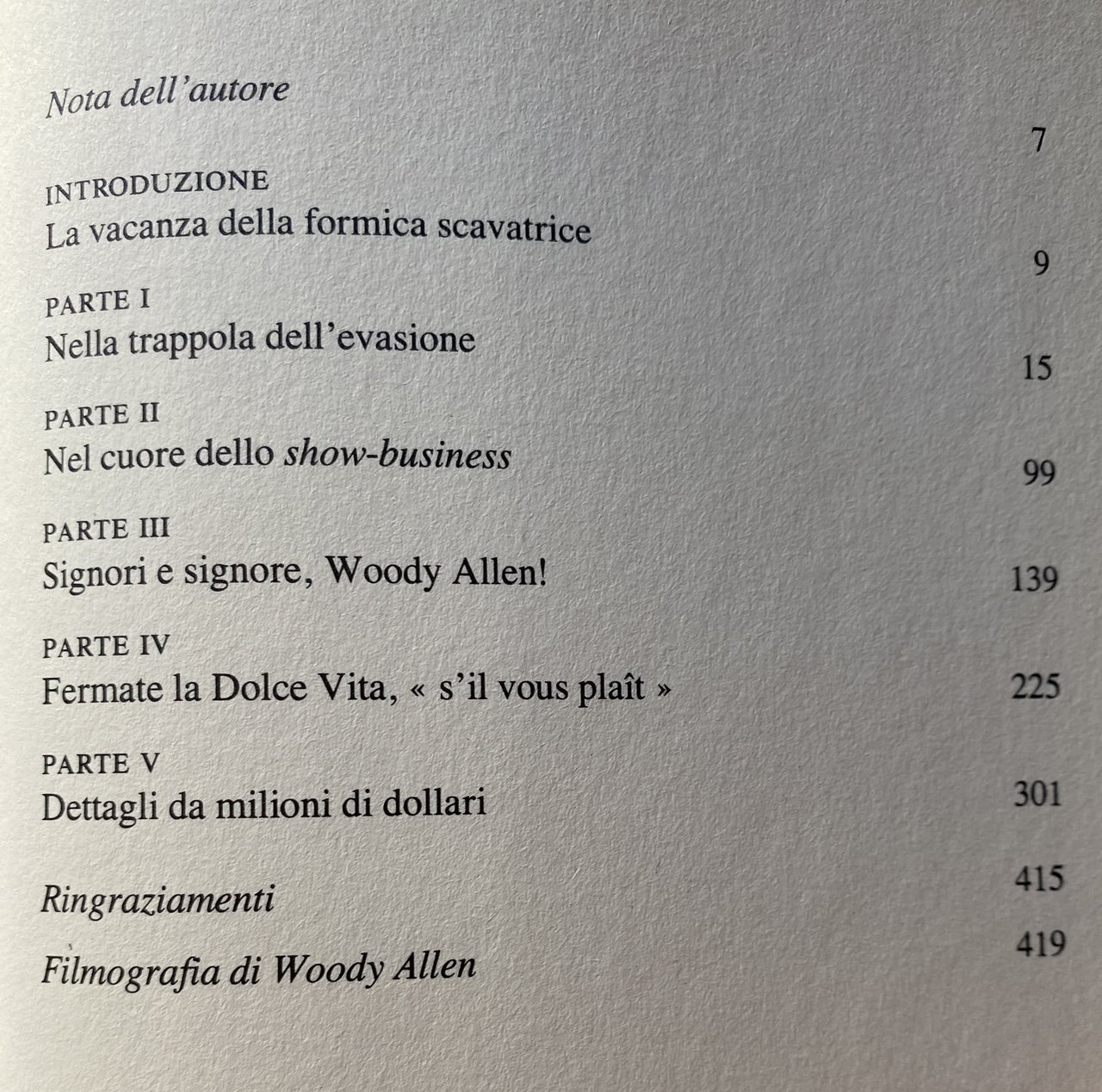 Soggetti: Biografie, Memorie, Cinema, Registi americani, Libri illustrati, Interviste, Conversazioni, Aneddotica, Curiosità, Celebrità Divi, Attori, Filmografia, Commedia leggera, Donne, Musica jazz, Ritratti Psicologia Battute umoristiche Citazioni Recensioni Umorismo Commedie brillanti Moviemaking, Freud Biographie Entretiens New York Intellettuali Stereotipi Ebrei Ebraismo Religioni Depressione Matrimonio Figli Moglie Soon-Yi Inediti Cinismo Morte Woodyphiles Fan Successi cinematografici Botteghino Europa America Cult Allan Alvy Annie Hall Artista Pubblico Danny Rose Brooklyn Personaggi Charles H Comico Fumetti Crimini Misfatti Danny Simon Diane Keaton Dianne Wiest Cena Dylan Padre Feldman Amici Divertente Hannah Harlene Jack Rollins Jean Doumanian Scherzi Konigsberg Ridere Louise Manhattan Marshall Brickman Mickey Money and Run Nettie Night Nykvist Performance Recitazione Attori principali Purple Radio Days Robert Greenhut Charles Rollins Joffe Rosenblum Sahl Santo Loquasto Scena Sceneggiatura Riprese Stand-up story Street Teatro Tony Roberts Scrittura Palomar Pictures Los Angeles Trama Lavorazione Cast Prendi i soldi e scappa Autopsicoanalisi Irrational Man Fotografia Montaggio Colonna sonora Festival Cannes Indiscrezioni Assistenti Aneddoti Troupe Set Ciak Vita privata Personalità Grande schermo Bergman Blue Jasmine Bob Hope Boston Story Budget Cate Blanchett Dialogo Emma Girare Helen Robin Hope Inquadrature Joaquin Khondji Amore Azione Lepselter Location Match Point Moonlight Pallottole su Broadway Parker Posey Ramsey Lewis Rita Inquadratura Stile Alan Alda Marlon Brando Michael Caine John Cusack Judy Davis Robert De Niro Leonardo DiCaprio Gene Hackman Scarlett Johansson Julie Kavner Liam Neeson Jack Nicholson Charlize Theron Tracey Ullman Sam Waterston Holliday Pantheon Comiche Film preferiti Classifiche Quarto Potere Migliori Duck Soup Airplane! Trouble in Paradise Born Yesterday Bergman De Sica Fellini Welles Kurosawa John Huston Jean Renoir Omicidio Mistero Rosa purpurea del Cairo Gialli Sweet Lowdown Proiettili Umoristi Critica Borghesia Capitalismo Collezionismo Bibliografia Riferimento Libri fuori catalogo Premio oscar Leone d'oro Carriera Mostra internazionale Venezia Estetica Slapstick Clarinetto Sofisticate Yiddish Groucho Marx Gag Stuart Hample Interiors Sesso Zelig Provaci ancora, Sam Stig Björkman Vicky Cristina Barcelona Midnight in Paris Mariti e mogli Pussycat Love and Death Il dormiglione Sleeper Il dittatore dello stato libero di Bananas Scenes from a Mall La maledizione dello scorpione di giada The Curse of the Jade Scorpion Hollywood Ending Anything Else Scoop Harry a pezzi Deconstructing Murder Mystery La dea dell'amore Mighty Aphrodite Tutti dicono I Love You Everyone Says I Love You Ombre e nebbia Shadows and Fog Her Sisters Accuse Abusi sessuali Violenza sessuale Tribunale Molestie Frank Maco Ponte Biographies Memoirs American directors Illustrated books Interviews Conversations Anecdotes Curiosities Celebrities Stars Actors Filmography Light comedy Women Music Portraits Psychology Humorous jokes Quotes Reviews Humor Brilliant comedies Intellectuals Stereotypes Jews Judaism Religions Depression Marriage Children Wife Unpublished works Cynicism Death Film successes Box office Europe Artist Audience Characters Comedian Comics Crimes and misdeeds Dinner Father Friends Funny Jokes Laughing Acting Main actors Scene Screenplay Filming Theater Writing Plot Processing Take Autopsychoanalysis Photography Editing Soundtrack Indiscretions Assistants Anecdotes Private life Personality Big screen Dialogue Filming Shots Love Action Style Comedies Favorite films Rankings Citizen Kane Best Mysteries Bullets Humorists Criticism Bourgeoisie Capitalism Collectibles Bibliography Reference Books out of print Golden Lion Award Career International Exhibition Venice Aesthetics Clarinet Sophisticated Sex Try Again, Sam Husbands and Wives Accusations Sexual Abuse Sexual Violence Court Harassment Bridge