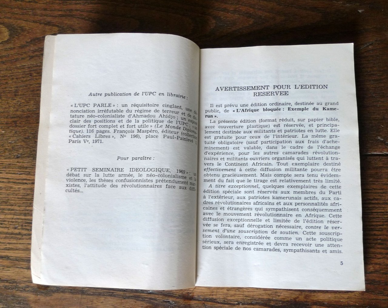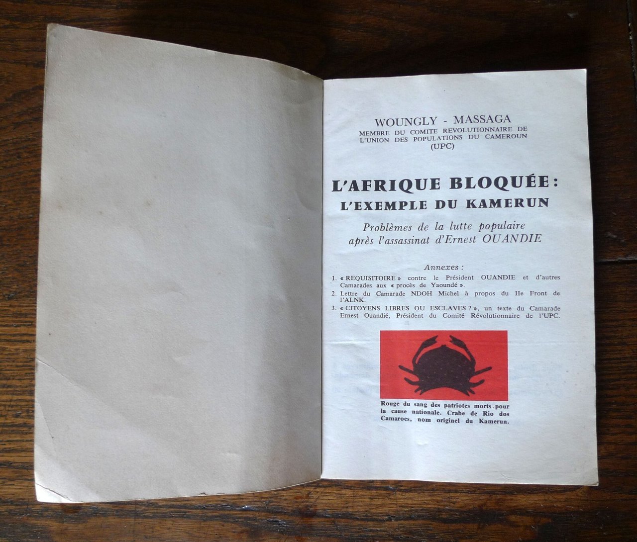 Woungly - Massaga,Membre du Comite Revolutionnaire de l'Union des Populations du Cameroun (UPC),L'AFRIQUE BLOQUÉE:L'EXEMPLE DU KAMEROUN.Problèmes de la lutte populaire aprèsl'assassinat d'Ernest Ouandie.Genève (Suisee), senza data (1962?),brossura, 15x10,5 cm., pp.255,testo in francese,peso: g.300cod.9397CONDIZIONI DEL LIBRO: buone,imperfezioni alla copertina