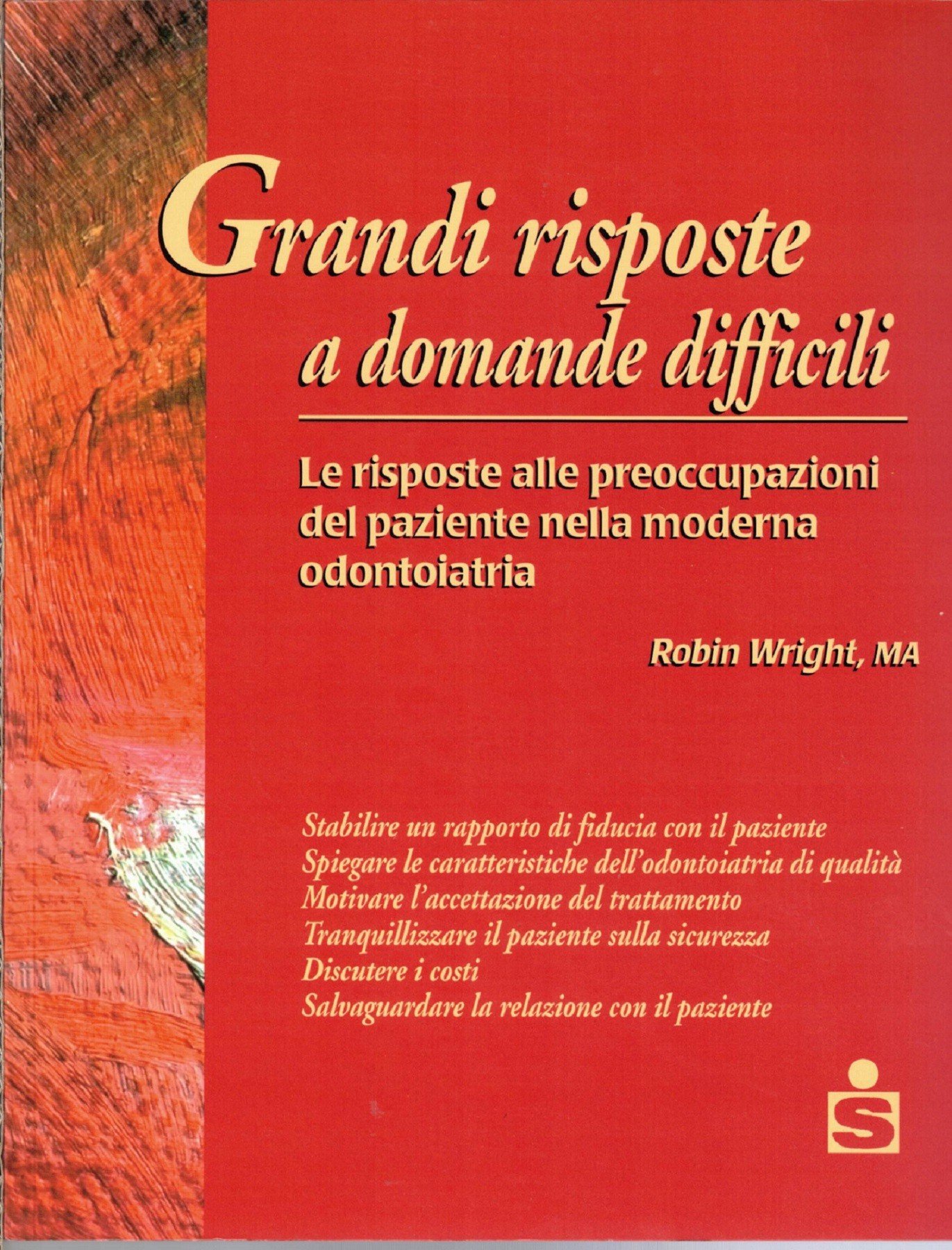 Robin Wright, Grandi risposte a domande difficili. Le risposte alle preoccupazioni del paziente nella moderna odontoiatria, revisione scientifica a cura di Carlo Fossati e Sabina Mantovani, traduzione di Eva Artale, Scienza e Tecnica Dentistica Edizioni Internazionali srl, Milano 2000, pp. IX, 150, ill. b.n., cm 25, br. ed. Integrazione del titolo alla prima di copertina: Stabilire un rapporto di fiducia con il paziente. Spiegare le caratteristiche dell’odontoiatria di qualità. Motivare l’accettazione del trattamento. Tranquillizzare il paziente sulla sicurezza. Discutere i costi. Salvaguardare la relazione con il paziente. Titolo originale: Tough questions, great answrs. Responding to patient concerns about today’s dentistry. Leggere tracce d’uso alla brossura, per il resto ottimo.