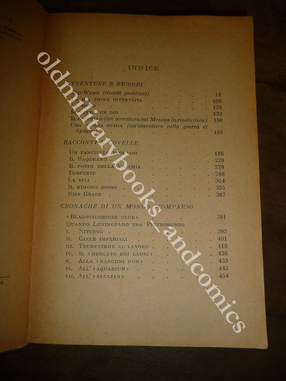 Di sorprendente livello artistico, eccezionale lettura. In 3 parti. 1) evoca la Cina al tempo dei boxer (1900) e delle invasioni e guerre russo-giapponesi, Rivoluz. in Messico, guerra civile di Spagna, buddismo e divinità, 2) affascinanti racconti e novelle (un geniale allucinante "fanciullo prodigio", Argentina, Giappone ecc.) 3) 7 "memorie" su San Pietroburgo al tempo dello zar, CACCIA e cani di razza per lo zar, lo scultore TRUBETZKOY milanese vegetariano tolstoiano lavora a san Pietroburgo con 14 cani e un lupo. Da non crederci.