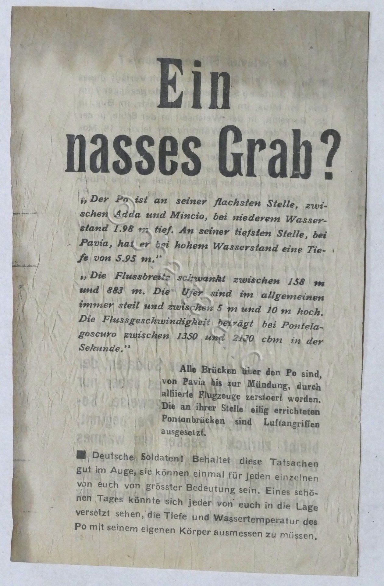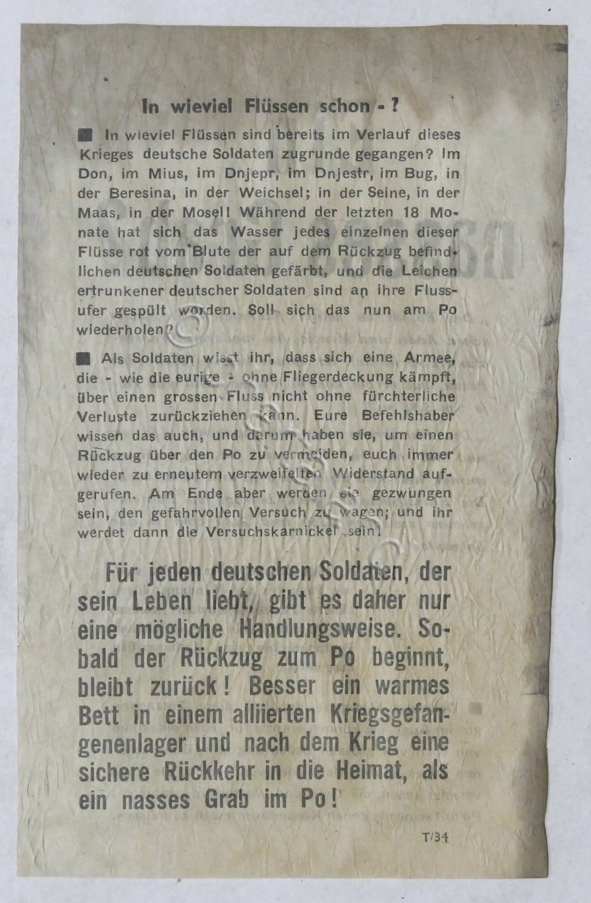 WWII - Volantino degli alleati per i soldati tedeschi in ritirata dall'Italia - Spiegazione della pericolosità, di attraversamento del fiume Po dopo che i ponti sono stati distrutti e consiglio di arrendersi anzichè, affogare - 1945Un foglio, dimensioni: 12 x 19 cm ca.