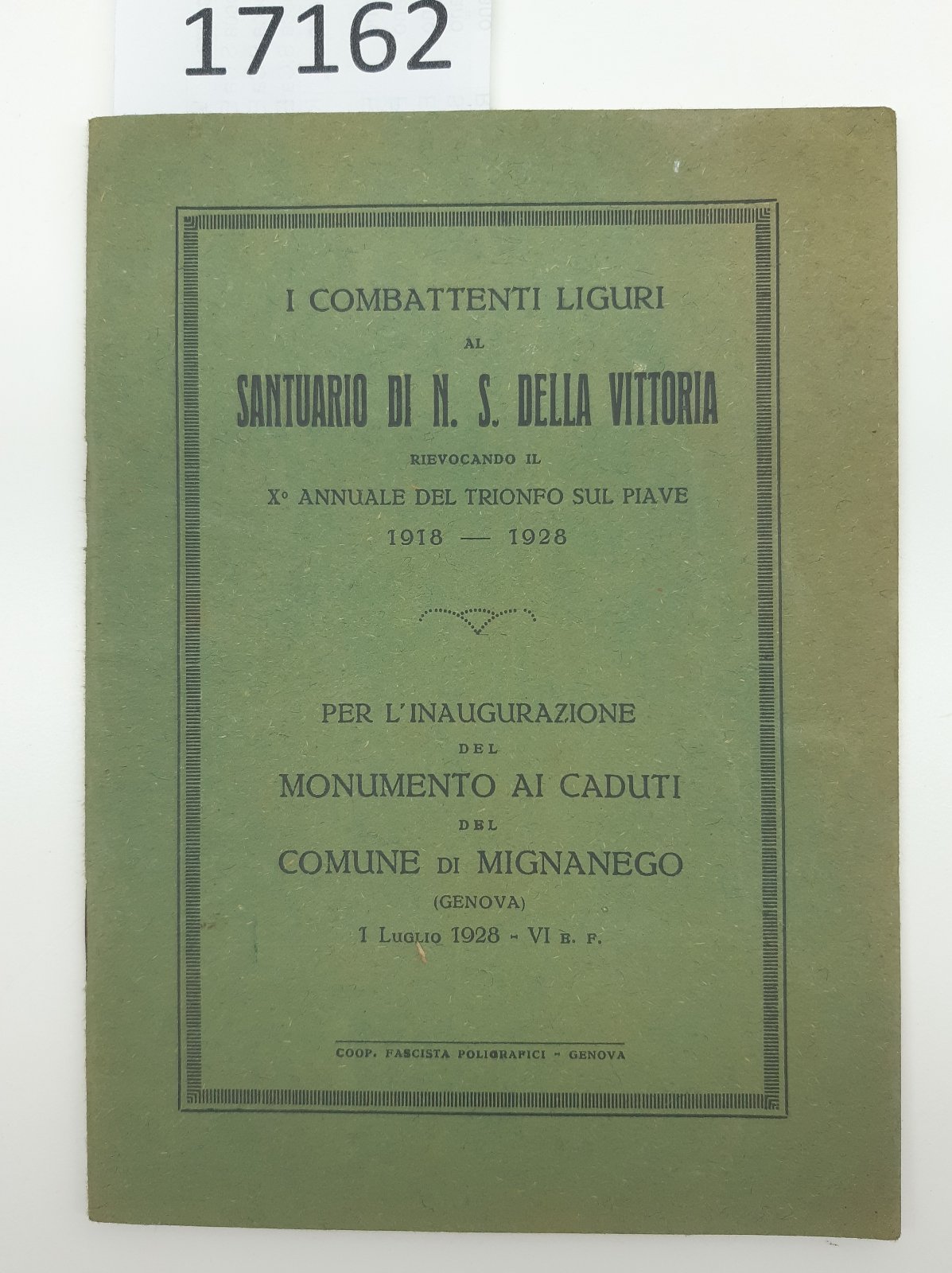 Per l'inaugurazione del monumento ai caduti dei comuni di Mignanego Genova primo luglio 1928 copertina morbida editoriale in discrete condizioni, lievi scoloriture al margine esterno del piatto inferiore, quarta di copertina con alcune macchie, tagli bruniti, interno in discreto stato, pagine leggermente brunite, testo riquadrato entro cornice, numero pagine 32 dimensioni cm 16,5 * 12