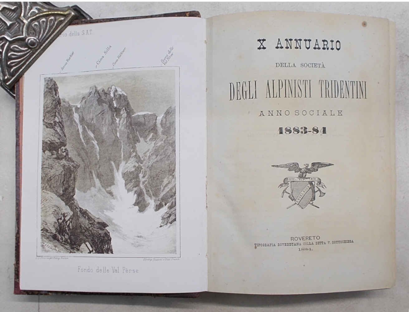 In 16° (cm. 19 x 13); pagg. (4), 544 + 4 di pubblicità e 1 minuscolo foglietto volante di errata; nel volume sono presenti in originale l'antiporta in tinta beige del fondo della Val Pèrse e le 8 tabelle di prospetti mineralogici di Fassa; 12 delle 14 altre carte, panorami e tavole sono unite in fotocopia; ottima m.pelle coeva con piccoli nervi, titoli e fregi in oro al dorso. VG. ** Decimo Annuario della S.A.T.