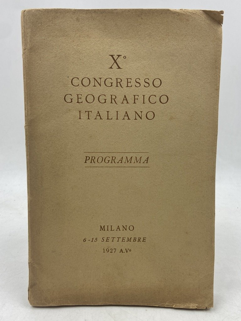 Brossura editoriale a stampa (sciupata, con riparazioni sul dorso), cm 18 x 12, pp 113 (1), illustrazione in nero al verso del frontespizio e alcune piante della sede del congresso in nero nel testo. Difetti sulla brossura, re-incollato al dorso. Programma del decimo Congresso Geografico Italiano, con elenco dei partecipanti ai comitati e commissioni, presentazione dei lavori e delle mostre, informazioni pratiche sulle sedi ed eventi collaterali, e riassunti delle relazioni (di Vacchelli, Zali, Ardito Desio su Giarabub, Rampazzi, Giusti, Biasutti e Gortani, De Capitani D’Arzago, Mori, De Filippi sulla Palestina, Bellincontri, Lucedio e Pavari, Jacobini, Gribaudi, Biasutti, Gramatica, Testa, Azzi, Jandolo, Ratto, Faintoli, Roberto Almagià sull’Albania e sulla bibliografia geografica, Errera, Benedetto, Tajani, Alberto Maria De Agostini sulla Cordigliera Patagonica, Toniolo, De Chaurand, Gortani, Conti, Dardano).