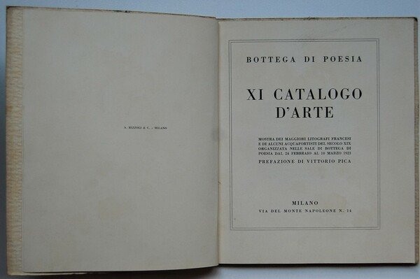 Bottega di Poesia, 1923. In-16 grande, brossura, pp. 40, con 14 tavole in bianco e nero fuori testo. Catalogo n. 11 della Bottega di Poesia. Pagine leggermente ingiallite per la qualità della carta, peraltro in buono stato.