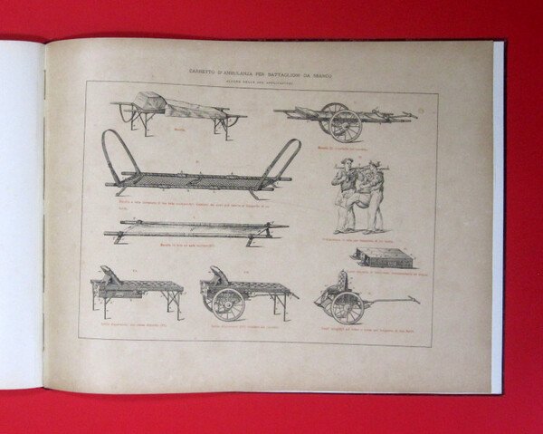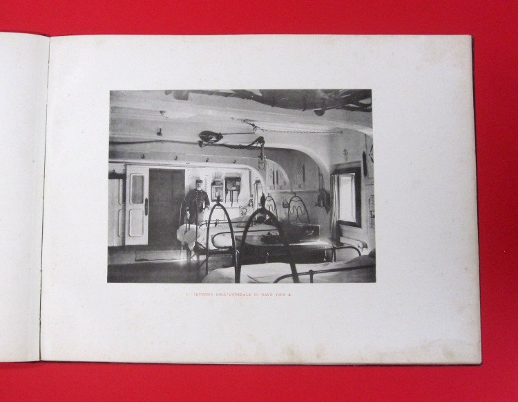 In folio formato album (cm 43x32,5) dorso in tela. 14 tavole fotografiche su carta pesante di navi ospedale militari. Lievi tracce di polvere -- Indice delle tavole 1)LEPANTO nave da guerra di 1^classe. 2) RUGGIERO DI LAURIA nave da guerra di 1^classe. 3)STROMBOLI nave da guerra di 2^classe. 4-5-6-7) Interno dell'ospedale di navi tipo A-B-C. 8-9-10) piano dell'ospedale di navi tipo A-B-C 11) Foto facciata dell'Ospedale Dipartimentale in Spezia 12)Piano dell'Ospedale Militare Marittimo di Spezia. 13) Una sala di chirurgia dell'Ospedale Dipartimentale in Spezia. 13-14) Carretto d'ambulanza per battaglioni da sbarco
