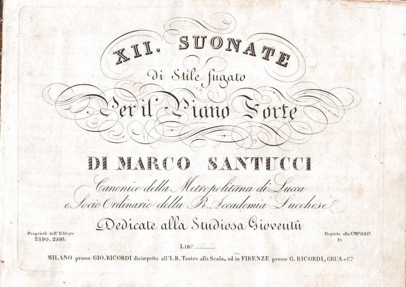 In-8° album, cm. 33x25, legatura con dorso in pergamena e cartonato coevo, pp. 25-24, doppio frontespizio e due pagine di testo, una di raccomandazione al giovane studioso dell'autore e una di corrispondenza sull'operato dell'autore da altri musicisti. Abrasioni alla legatura. -(Marco Santucci, Camaiore, 4 luglio 1762 – Lucca, 29 novembre 1843, è stato un compositore e teorico musicale italiano.