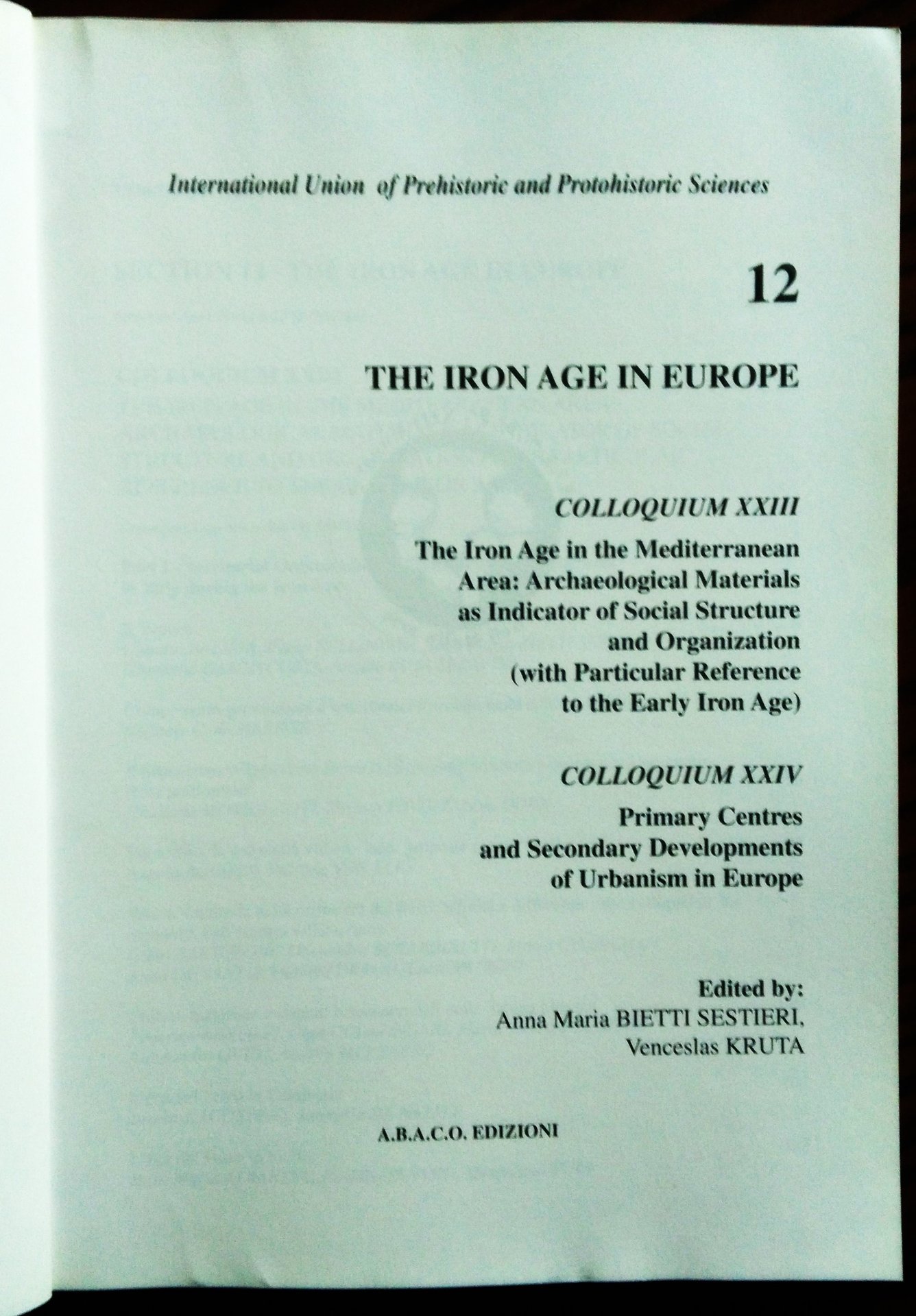XIII International Congress of Prehistoric and Protohistoric Sciences: Forli (Italia) 8-14 September 1996 /12 The Iron Age in Europe. Colloquium XXIII - The Iron Age in the Mediterranean Area: Archaeological Materials as Indicator of Social Structure and Organisation (with Particular Reference to the Early Iron Age). - Colloquium XXIV - Primary Centers and Secondary Developments of Urbanism in Europe.