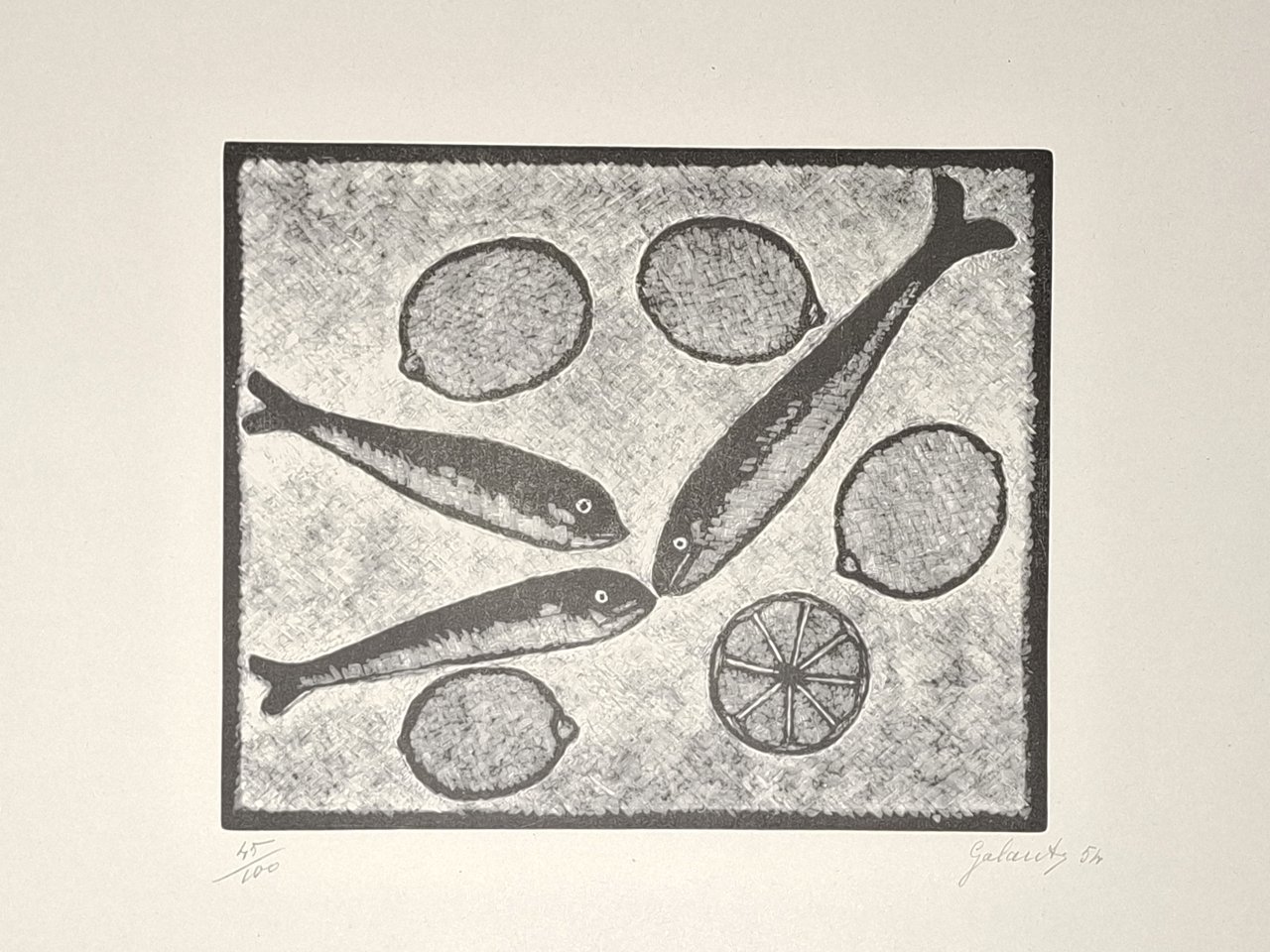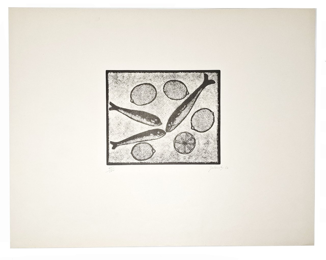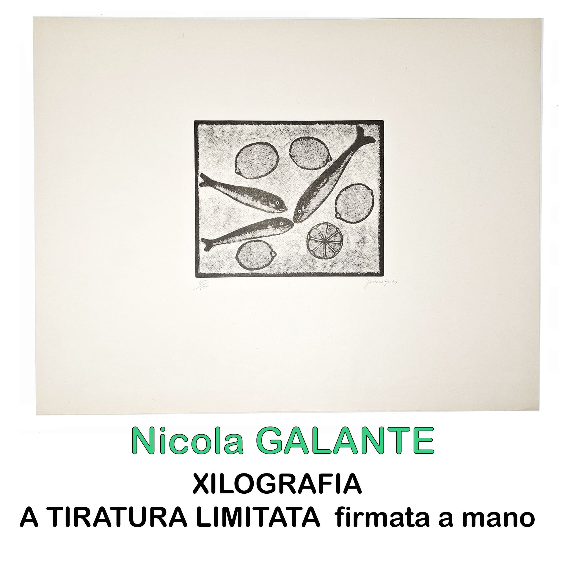 Xilografia numerata (45 / 100), firmata e datata a matita dall'autore: 'Galante 54', raffigurante, in un riquadro rettangolare, pesci e limoni. Su foglio di carta con ampi margini. Dimensioni del foglio: 50 x 39 cm circa. Stato di conservazione: ottimo. Nicola Galante (Vasto 1883 - Torino 1969) fu un celebre pittore italiano, che, tra l'altro, è ricordato nei 'Sei di Torino'. Splendida litografia, a bassissima tiratura, numerata e firmata dall'artista che, catturando l'armonia e la delicatezza della natura, è in grado di donare un tocco di raffinata eleganza senza tempo all'ambiente. Occasione, per collezionisti d'arte, di aggiudicarsi una xilografia originale di un maestro della grafica italiana.