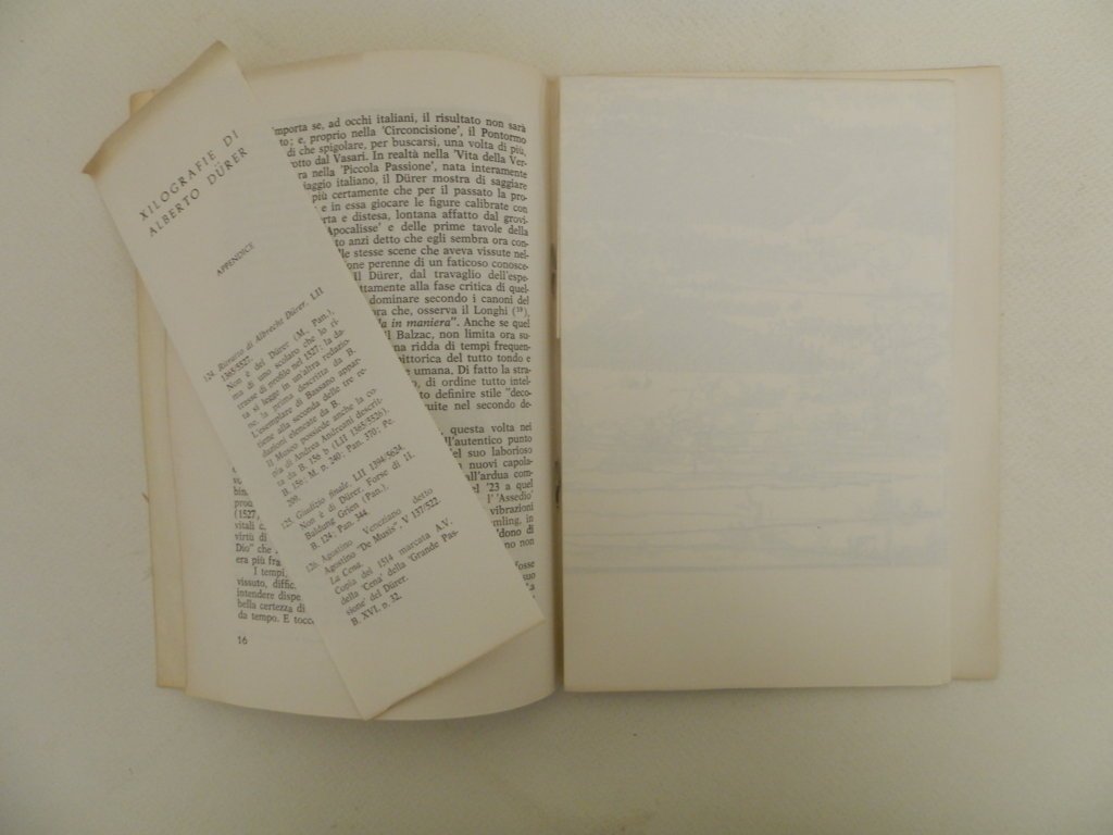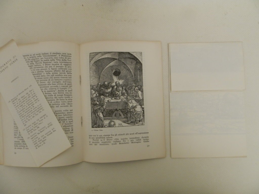8^, mm 215x160, pp. 30, brossura editoriale illustrata in bianco e nero da una riproduzione di una xilografia di Albrecht Durer con velina protettiva, eccellente stato di conservazione, velina con lievissimi aloni ai margini, ex libris applicato al contropiatto. Cordicella laterale. In barbe, impresso su carta forte. Calendario a tema mariano per l'anno 1908 illustrato con le celebri e splendide xilografia di Dürer con allegato foglio fac simile de L'Assedio esemplare presente nel museo civico di Basano e scheda editoriale.. *** TUTTI I NOSTRI LIBRI SONO VISIBILI PREVIO CONTATTO MAIL O TELEFONO NELLA NUOVA SEDE DI MILANO: LIBRERIA COSMOPOLIS, VIA JOMMELLI, 22. ***