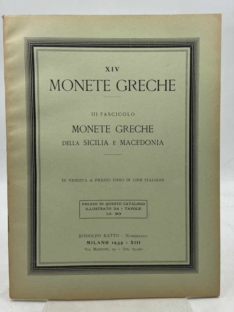 Brossura editoriale a stampa, cm 28x22, pp 33-48 con 6 tavole in nero protette da velina. Ottimo stato. Quattrodicesimo dei listini a prezzo fisso che il grande numismatico genovese pubblicò nell’ultima fase della sua carriera, rientrato a Milano nel 1931 dopo la stagione delle importanti aste che aveva tenuto a Lugano nel decennio precedente. Proposte 534 monete delle zecche siciliane e macedoni. Listino di vendita del numismatico Rodolfo Ratto (Genova 1866 - Milano 1949). Nato a Genova, Rodolfo Ratto aprì la sua attività in quella città nel 1893 per spostarsi a Milano nel 1910; nel 1921 si trasferì a Lugano per rimanervi fino al 1930. Nel corso della sua lunga carriera pubblicò numerosissimi cataloghi, alternando listini a prezzi segnati a vendite all’incanto di notevole rilevanza. A Milano e soprattutto in Svizzera privilegiò le vendite all’asta dando alle stampe i suoi lavori di maggior respiro e importanza, su tutti la vendita del 1930 che disperse la sua impareggiabile collezione di monete bizantine e chiuse la stagione luganese. Studioso preparato e competente, nei cinquant’anni che separano il primo e l’ultimo listino Rodolfo Ratto pubblicò oltre duecentomila monete e medaglie, che ordinò con acume e rigore scientifico lasciando una documentazione di ineguagliata qualità.