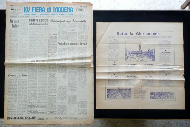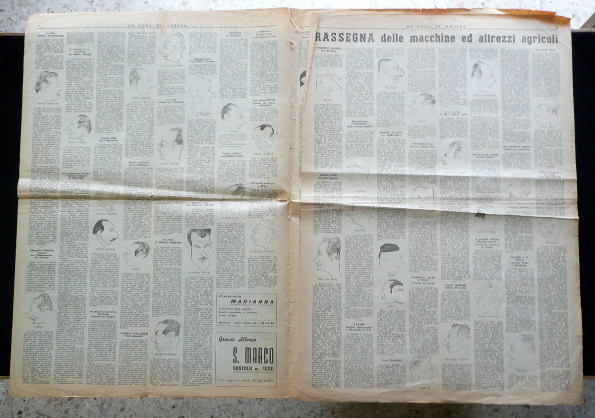 Giornale (numero unico), XV Fiera di Modena Rassegna agricola - industriale - artigiana e mostra avicola S. d. ma 1953; cm 62x43,5; pp. 6 con numerosi ritratti caricaturali in b/n nel t. di industriali e artigiani modenesi; fogli sciolti. Accluso foglio volante con poesie di Ferruccio Cambi (vedi foto). Condizioni di conservazione Esemplare complessivamente in buono stato con tracce d'uso, piega centrale di conservazione, lievi ingialliture dovute al tipo di carta e alcune minuscole bruniture; margini angoli e dorso con qualche minimo strappetto e accenno di pieghetta. Prima pagina con qualche segnetto a pastello rosso e nota numerica al margine sup. Foglio volante ben conservato con pieghe di conservazione, un margine esterno con alcuni piccoli strappetti. Numero completo, con numerose caricature di artigiani e industriali modenesi. Accluso foglio volante che contiene poesie di Ferruccio Cambi. SC03.D15116 N F