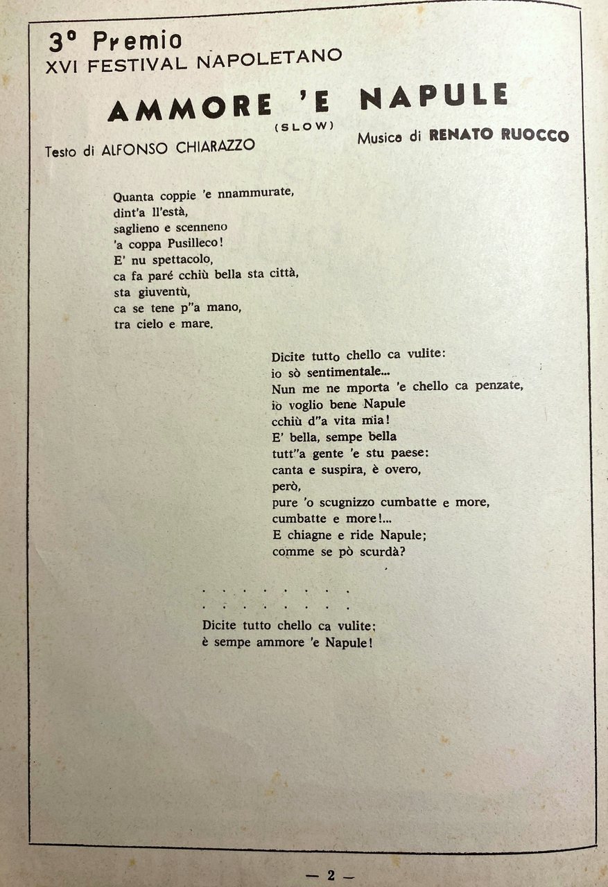 Soggetti: Canzone napoletana, Napoletanità, Collezionismo cartaceo, Spartiti musicali, Musica, Dialetto napoletano, Memorie, Testi, Canzoni, Festival, Teatro Politeama, Mike Bongiorno, Gabriella Squillante, Mirna Doris, Tony Astarita, Claudio Villa, Mario Abbate, Fulvio Picone, Orchestra, Cantanapoli, Cantautori napoletani, Cantanti, Anni Sessanta, Da collezione, Raccolte Vintage, Pubblicità, Advertising, Amore, Melodici, Classici, Bossa Nova, Strumenti, Note, Strumentale, Pianoforte, Mandolino, Ritornello, Trasmissioni Rai, Piedigrotta, Feste, Tradizioni culturali locali, Funiculì Funiculà, Marechiaro, 'O sole mio, Torna a Surriento, Ettore De Mura, Eventi ricorrenti di settembre, Rarità, Reclame, Neapolitan song, Neapolitanity, Paper collectibles, Musical scores, Music, Neapolitan dialect, Memories, Texts, Songs, Theatre, Orchestra, Cantanapoli, Neapolitan singers Songwriters, Singers, Sixties, Collectibles, Collections, Advertising, Love, Melodic, Classics, Instruments, Notes, Instrumental, Piano, Mandolin, Chorus, Rai broadcasts, Parties, Local cultural traditions, Recurring events in September, Rarities