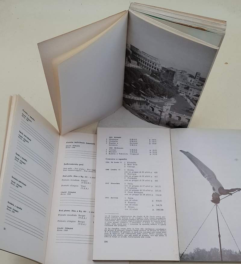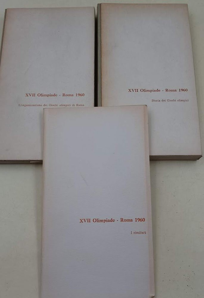 3 voll.in 8', di cui 2 in cart. ed., dorso in tela e uno, opuscolo a punta di spillo: Storia dei giochi olimpici, pp. 216, ill. a p.pagina n.t.; L'organizzazione dei Giochi olimpici di Roma, pp. 146, ill. in n. e col. n.t.; I risultati, pp. 45, solo testo; volumi in buono stato, ordinarie bruniture e segni del tempo. ***Due to bureaucratic reasons, books dated over 70 years old cannot be immediately exported, please contact us before placing the order.***