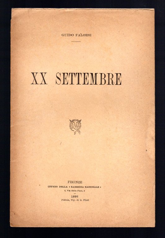 Opuscolo vintage. Discorso di Falorsi Guido (1847-1920) durante la conferenza tenuta per invito dell'Associazione fra la gioventù monarchica, Firenze, 20 settembre 1898. Estratto da Rassegna Nazionale, anno XX, fascicolo ottobre 1898. Intonso. Usura da scaffale. Ordinario segno del tempo.