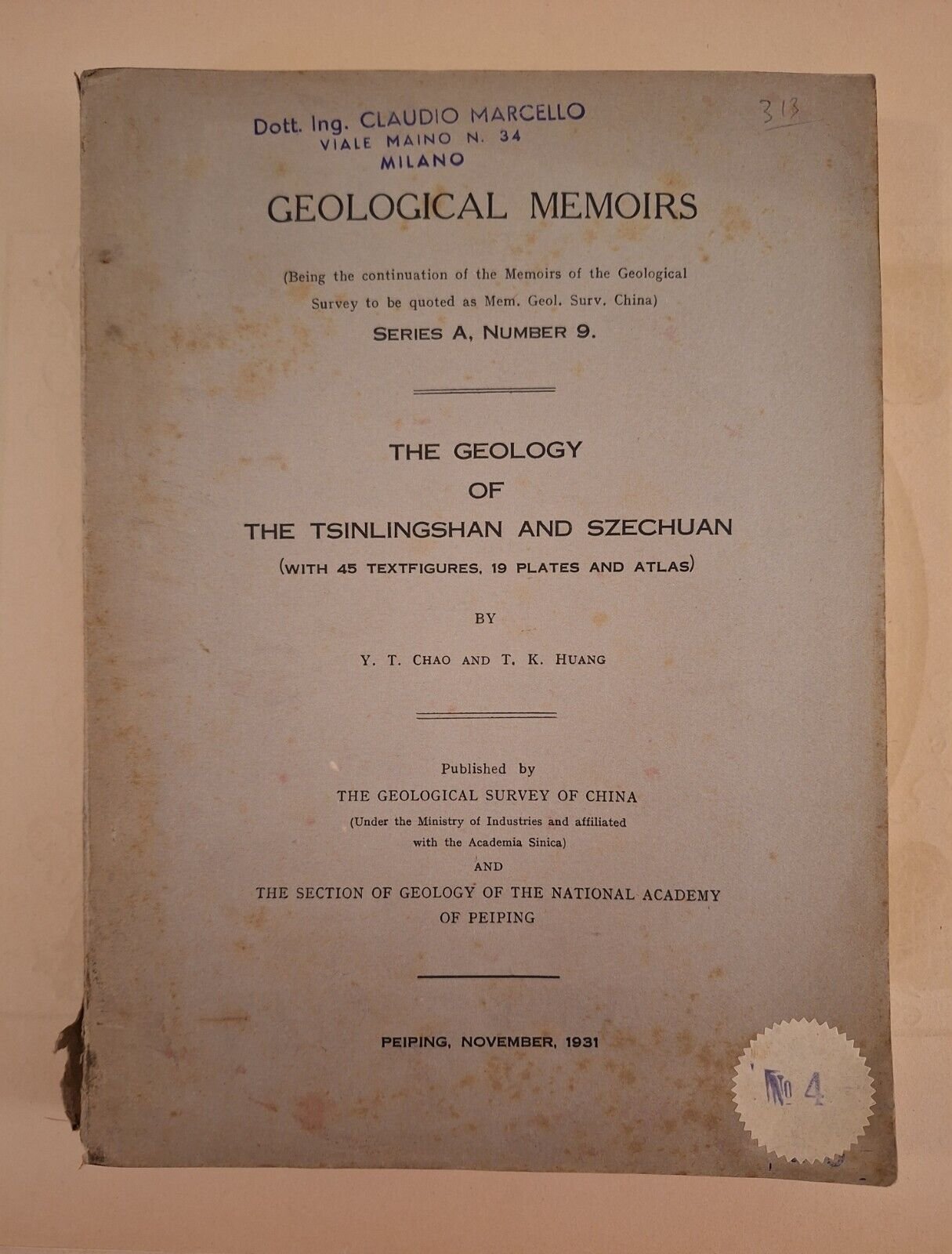 Y.T. CHAO K. HUANG GEOLOGY OF TSINLINGSHAN AND SZECHUAN PEIPING 1931In 8° grande, legatura editoriale, copertina illustrata, ill. in b/n, tavole ripiegate.Testo in inglese e in cinese.Lievissimi segni alla copertina. Pagine fresche e pulite.
