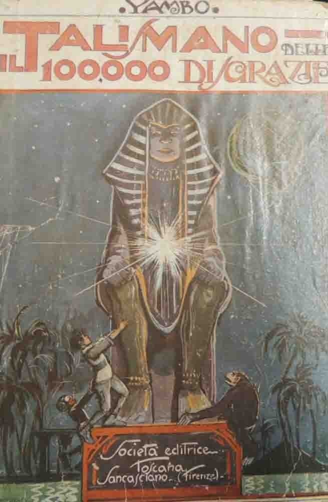 Yambo, Il talismano delle centomila disgrazie. Avventure straordinarie intorno al mondo di un ragazzo bianco e di un ragazzo nero. Testo e 60 disegni di Yambo, Attilio Quattrini Editore, Firenze 1928, pp. 256, ill. b.n., cm 25, legatura in mezza tela con titoli al dorso. Opera di Enrico Novelli (1876-1943), noto con lo pseudonimo di Yambo. All’interno: cartoncino editoriale ripiegato intitolato Celebri fantocci lirici di Yambo cav. Enrico Novelli, Cop. Tip. L’Adriatica, Castellamare Adriatico 1923, cm 25, contenente alcune liriche scritte da Yambo per il suo noto teatro di marionette (dal nome I Fantocci di Yambo). Tracce d’uso, più evidenti alla legatura che presenta strappetti e piccole mancanze alle illustrazioni applicate ai piatti, una leggera ombra di gora al margine superiore delle prime carte, segni del tempo, per il resto ben conservato.