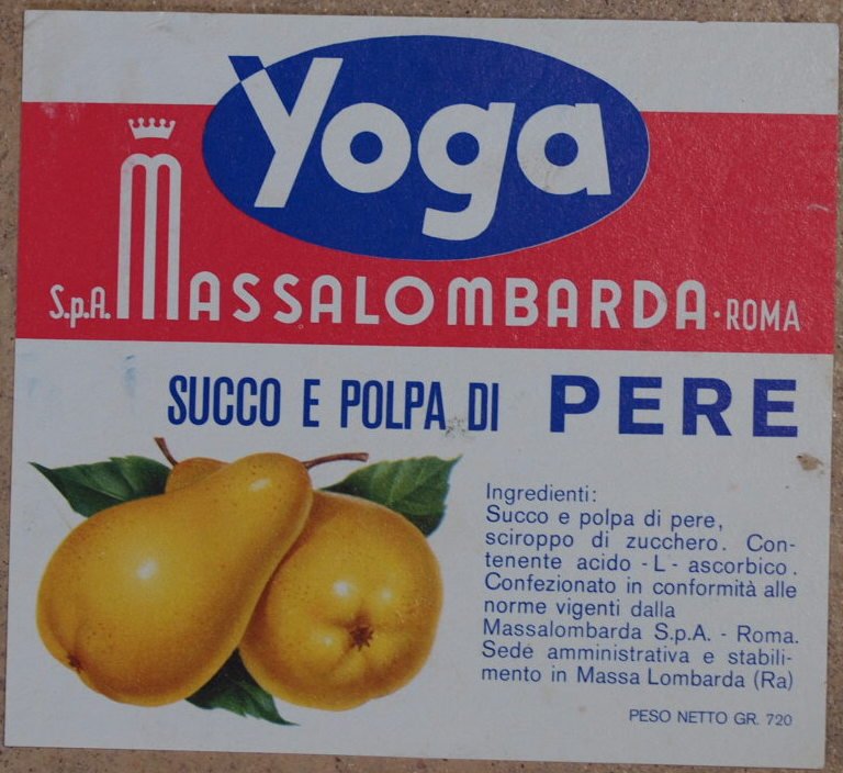 Bella etichetta del succo di pera Yoga degli anni '70. In buone condizioni. Formato cm. 10x11. Beautiful label of Yoga pear juice of 1970's. In good conditions. Size cm. 10x11.