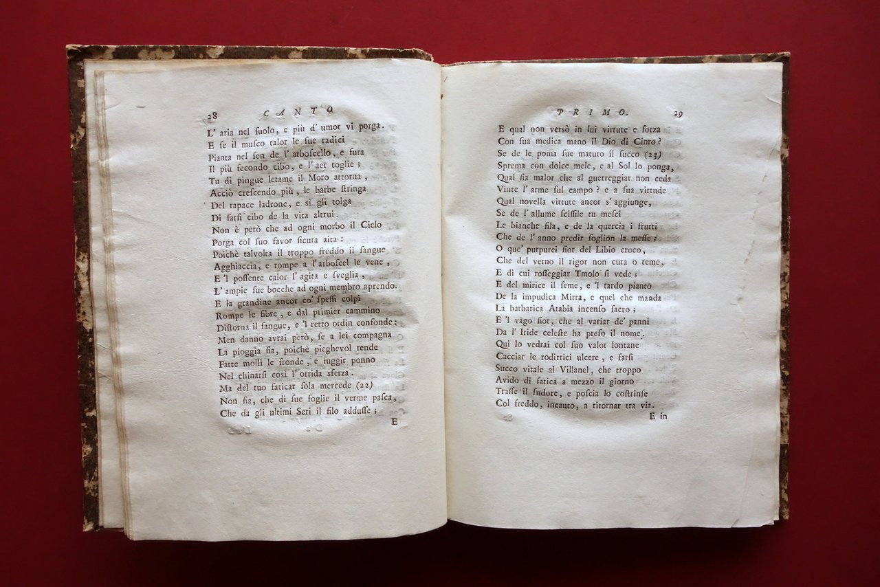 Settecentina, Zaccaria Betti, † del Baco da Seta canti IV con annotazioni Per Antonio Andreoni, in Verona 1756; cm 24x18; pp. [8]-214 con bei capilettera, testatine e finalini incisi in b/n (Francesco Lorenzi dis. - Domenico Cunego scolp.); frontespizio anch'esso con bella ill. incisa in b/n. Legatura d'epoca in tutto cartonato muto marmorizzato. Alla prima bianca dedica autografa dell'autore (firmata l'Autore; vedi foto). † Condizioni di conservazione Buone condizioni con tracce d'uso, coperta con alcune minime mancanze e piccole abrasioni al rivestimento marmorizzato. Interni molto ben conservati con minimo foxing; a pagina 167 una piccola macchietta di inchiostro molto diluito che non comporta perdite di testo. Margine destro delle pp. 29-30 con piccolo difetto tipografico (margine irregolare), senza alcuna perdita di testo. † Poema didascalico in versi sciolti, suddiviso in IV canti, avente come tema l'allevamento dei bachi da seta. Di particolare interesse in merito a tale argomento le note ai canti poste al termine del testo. Rara prima edizione del 1756, con bei capilettera, testatine e finalini finemente realizzati da Francesco Lorenzi e Domenico Cunego. Alla prima bianca dedica autografa dell'autore (firmata l'Autore"; vedi foto). † SETT233.L24646 N "