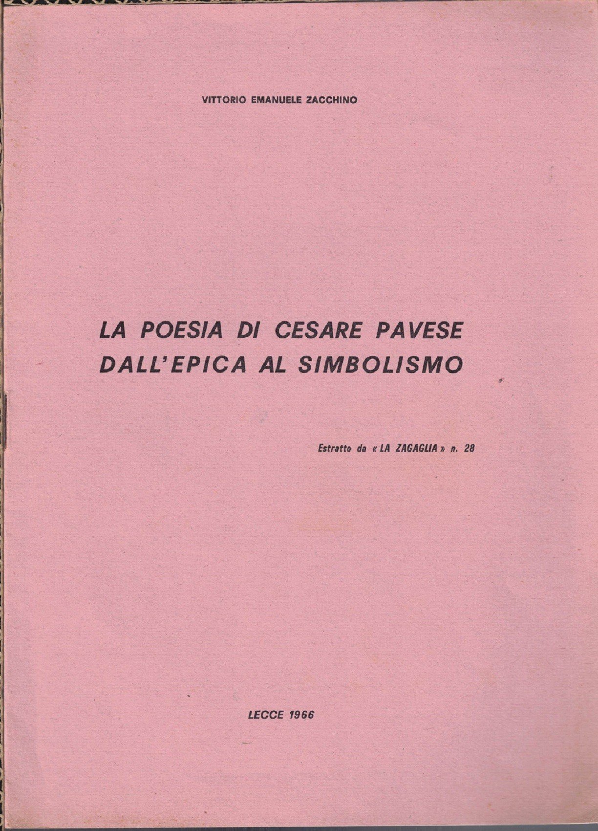 Vittorio Emanuele Zacchino, La poesia di Cesare Pavese dall’epica al simbolismo, s.n., Lecce 1966, pp. 13, cm 27, pubblicazione rilegata a punto metallico. Estratto da La Zagaglia, n. 28. A margine del frontespizio piccola etichetta in carta con numero progressivo di classificazione. Lievi tracce d’uso, minima brunitura della carta, per il resto ottimo.