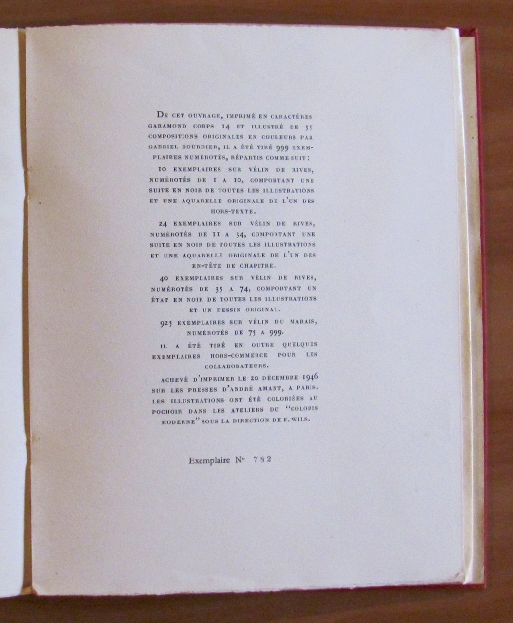 35 splendide illustrazioni colorate a pochoir n.t. e f.t., nell'Ateliers du Coloris Moderne sotto la direzione di F. Wils, di Gabriel Bourdier.. Ed. Felix Bottin et Fils - Nice, I edizione 1946. Tiratura Limitata a 925 Esemplari Numerati, sur velin du Marais, da 75 a 999, nostro N° 782. Brossura editoriale, protetta da acetato originale, inserita in cartella in velluto con titoli al dorso e custodita in ulteriore astuccio cartonato, sempre in velluto. 20x26; pp.168. Intonso, Raro e Splendido Esemplare. , Ottimo (Fine)