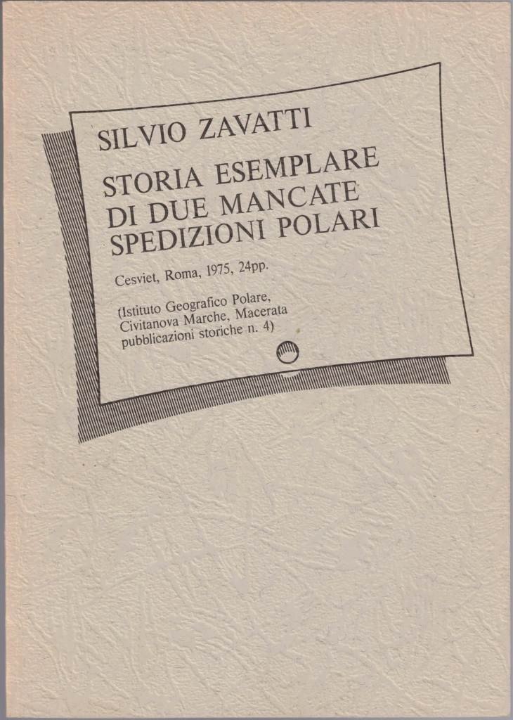 Silvio Zavatti, Storia esemplare di due mancate spedizioni polari. (Con documenti inediti), Cesviet, Roma 1975, pp. 21, cm 24, rilegatura a punto metallico. In testa al frontespizio: Istituto Geografico Polare – Civitanova Marche (Macerata). Collana: Pubblicazioni storiche, n. 4. Indice: La progettata spedizione in Groenlandia – La progettata spedizione antartica. Minime fioriture, per il resto perfetto. Raro.