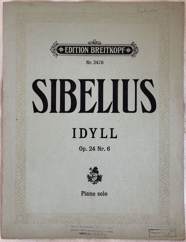 Edizione del 1904 di questa melodia per pianoforte "Idyll" del compositore finlandese Jean Sibelius (1865-1957), dall'opera 24 n. 6. In buone condizioni. Copertina editoriale in buone condizioni con lievi usure marginali. Legatura in buone condizioni. Pagine in buone condizioni con rare fioriture. In folio. cm. 30,5x23. Pp. 5.Edition of 1904 of this melody for piano "dyll" by the finnish composer Jean Sibelius (1865-1957), from the opera 24 n. 6. In good conditions. Editorial cover in good conditions with lightly worn in the extremities. Binding in good conditions. Pages in good conditions with occasional foxing.In folio. cm. 30,5x23. Pp. 5.<BR><BR>