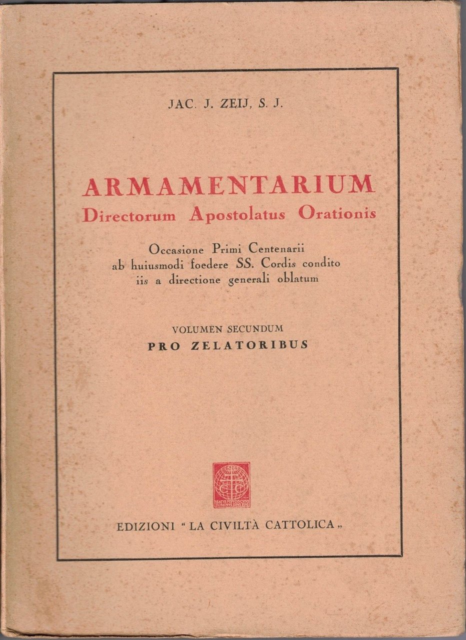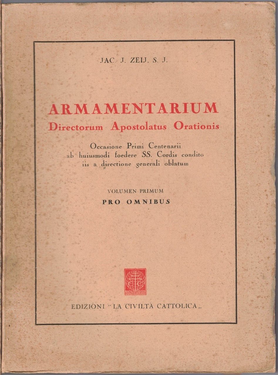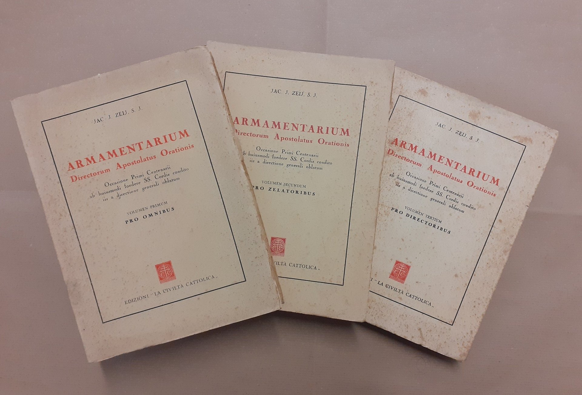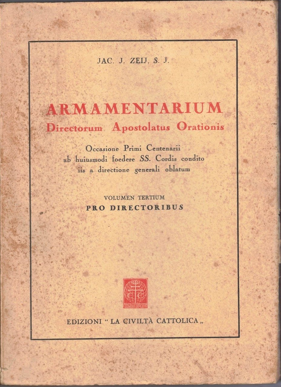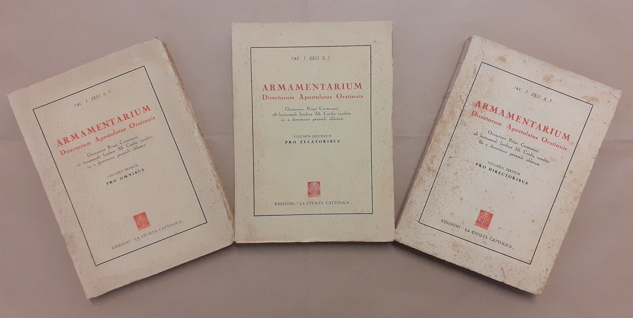 Jac. J. (Jacobus Johannes) Zeij, Armamentarium directorum apostolatus orationis. Occasione primi centenarii ab huiusmodi foedere SS. Cordis condito iis a directione generali oblatum, Edizioni La Civiltà Cattolica, s.l. (ma stampato a Roma, presso la So. Gra. Ro.) 1946, 3 voll., pp. totali VIII, 1174, cm 22, br. ed. Testo in lingua latina. Volume primo: Pro omnibus, pp. 320. Volume secondo: Pro zelatoribus, pp. 412. Volume terzo: Pro directoribus, pp. VIII, 442. Leggere tracce d’uso alla brossura del terzo volume, per il resto fioriture, minima brunitura della carta, ma insieme in ottimo stato di conservazione, perfetti i primi due volumi. Intonsi.